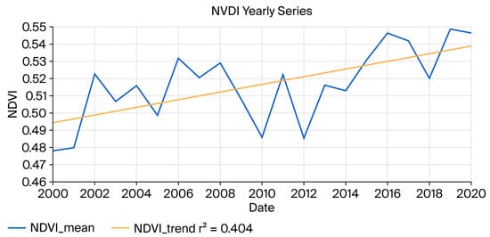 Temporal trend of the NDVI-derived vegetation index in Kunming from 2000 to 2020.