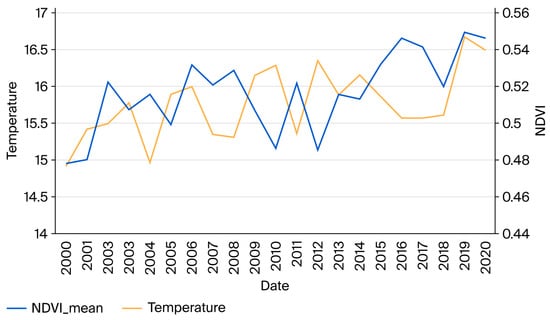 Temporal variations in temperature and the NDVI-derived vegetation index in Kunming (2000–2020).