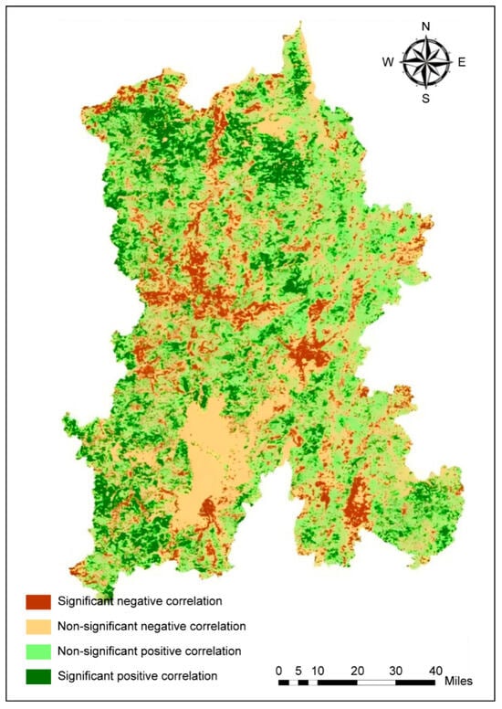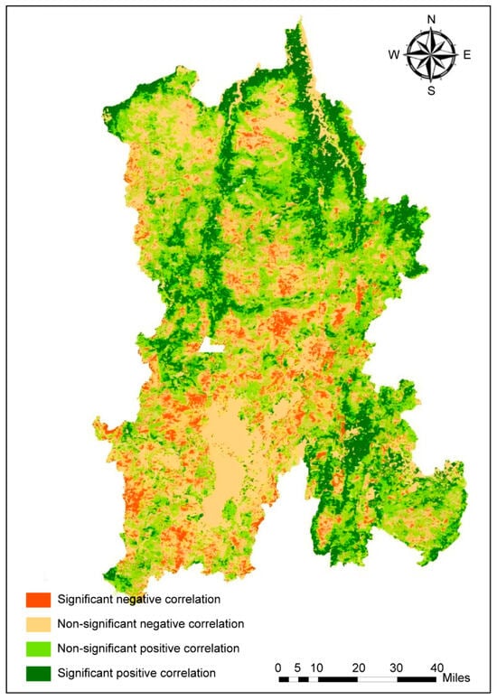 Spatial correlation between temperature and the NDVI-derived vegetation index in Kunming. Note: Significant negative correlation (−0.85 to −0.3), insignificant negative correlation (−0.3 to 0), insignificant positive correlation (0 to 0.3), and significant positive correlation (0.3 to 0.82).