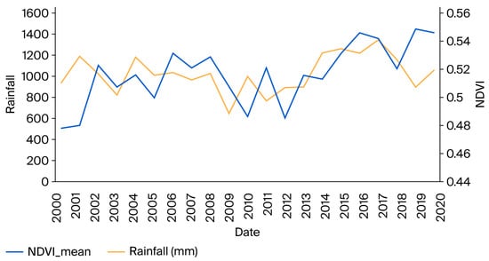 Temporal variations in annual precipitation and the NDVI-derived vegetation index in Kunming (2000−2020).