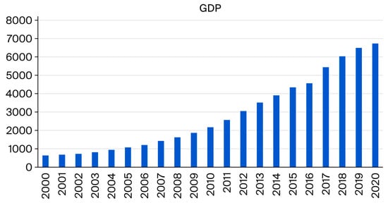 As shown in Figure 7, which illustrates GDP changes in Kunming from 2000 to 2020, the city experienced remarkable economic growth during the study period. GDP increased from CNY 63.61 billion in 2000 to CNY 673.38 billion in 2020, representing a more than tenfold expansion over 21 years. Between 2003 and 2015, Kunming’s annual GDP growth rate consistently exceeded 10%, peaking at 19.18% in 2012.