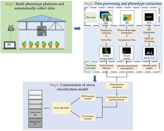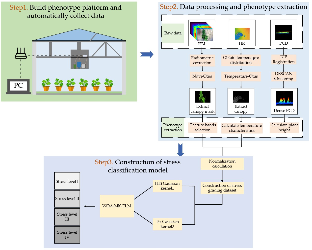 To overcome these limitations, we designed a three-axis gantry platform with high positional precision. This integrated system enables synchronized operation of a hyperspectral camera, a thermal infrared imager, and a LiDAR sensor to acquire complementary physiological and structural data of plants. The platform supports a multimodal data processing framework that extracts features indicative of plant water stress. The framework first applies sensor-specific image processing techniques to obtain relevant features. Next, a multi-kernel extreme learning machine (WOA-MK-ELM) model, optimized using the whale swarm algorithm, is constructed. This model adaptively fuses hyperspectral and thermal features through a double Gaussian kernel, enabling precise classification of water stress levels. Experimental results demonstrate that the hybrid model achieves classification accuracy notably higher than that of single-sensor models.