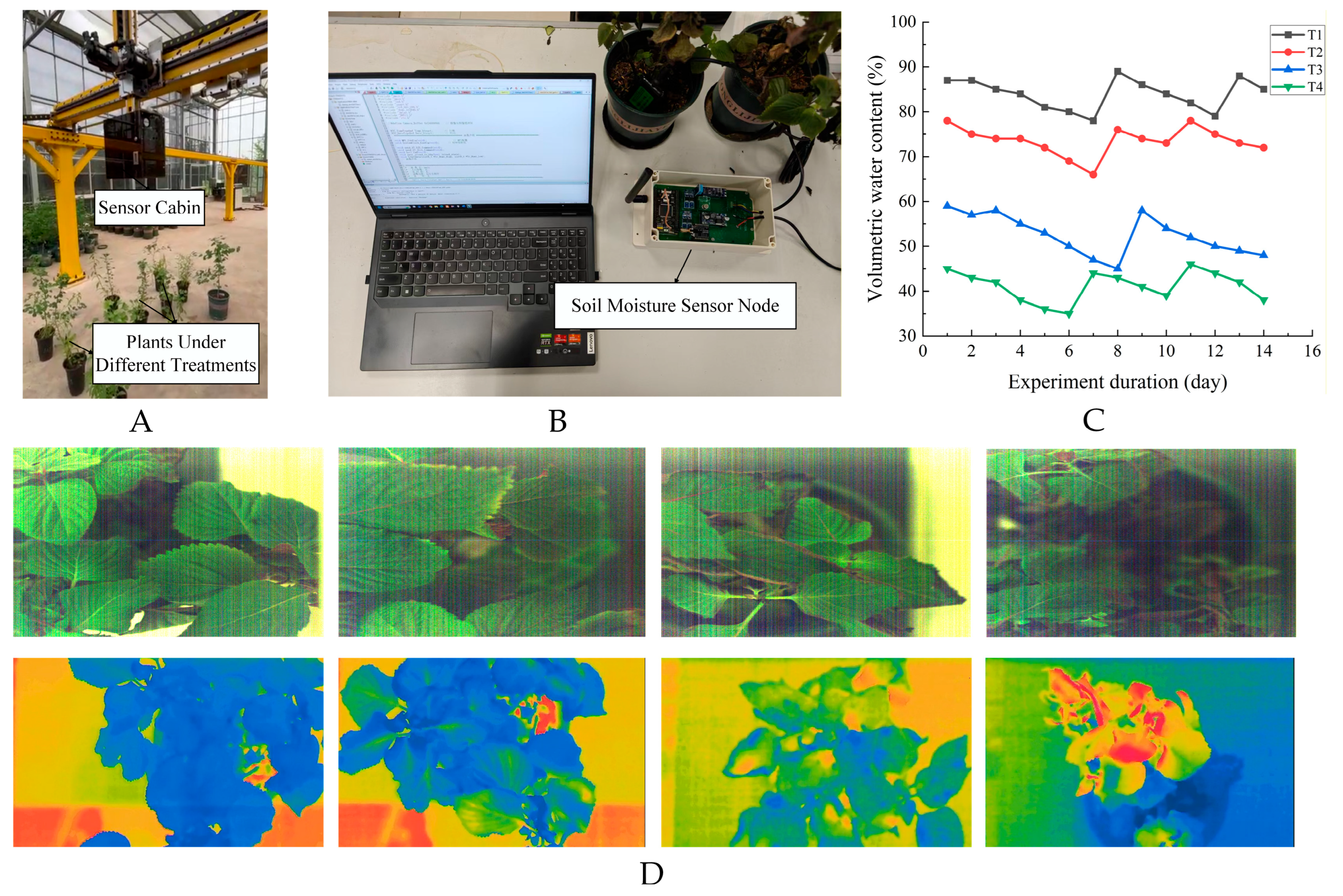 14]. However, despite progress in field-based remote sensing, controlled indoor systems remain essential for isolating the physiological drivers of drought responses and for validating multimodal fusion methods under repeatable condition. In contrast, indoor phenotyping systems offer significant advantages through precise environmental control. They provide an ideal environment for systematically analyzing plant physiological responses to specific stresses, such as drought, and for establishing robust diagnostic models. This controlled setting effectively reduces the impact of confounding factors. Examples of such platforms include LemnaTec’s Scanalyzer HTC (Germany) and Crop3D from the Chinese Academy of Sciences’ Institute of Botany [
