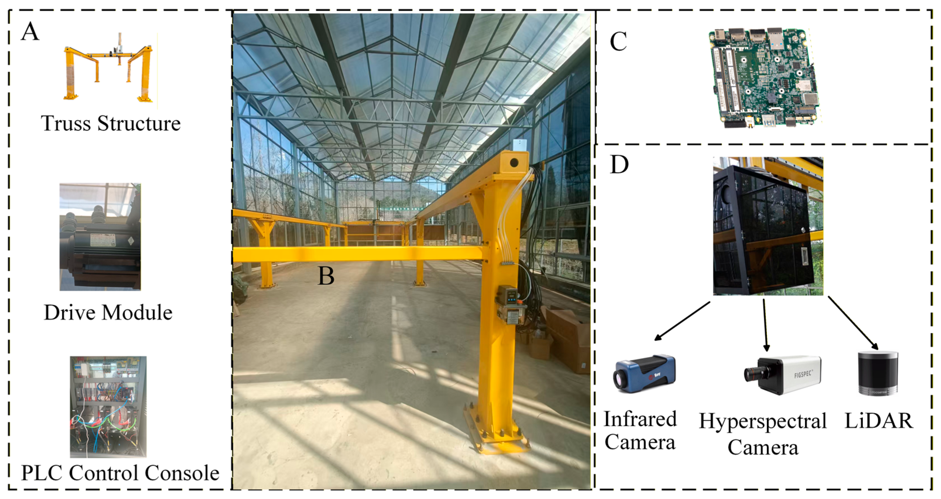 Part D of the platform is the sensor cabin, which combines multiple sensing systems for comprehensive data collection. It is mounted on the truss’s Z-axis and can move vertically to capture images at various plant heights. The cabin contains three sensors. First, an AT61P thermal infrared camera (IRay Technology Co., Ltd., Yantai, China) operates at 12 V, detects temperatures from −20 °C to 150 °C, and provides images at 640 × 512 pixels with ±2 °C accuracy; it is used to monitor plant water status. Second, an FS-22 hyperspectral camera (Hangzhou CHNSpec Technology Co., Ltd., Hangzhou, China) runs on an internal 18 V battery, offers 640 × 480 pixel resolution, automatic focusing, and a spectral range of 400–1000 nm, enabling assessment of plant physiological and biochemical characteristics. Third, an RSHelios LiDAR unit (RoboSense Technology Co., Ltd., Shenzhen, China). It installed in a fixed position within the sensor cabin, mounted on the truss’s Z-axis. The LiDAR performs mechanical spinning (rotating) scans with 32 channels, covering a full 360° horizontally and 26° vertically, with a horizontal angular resolution of 0.4°. The sensor acquires point clouds at a frequency of 20 Hz and stores the data in PCD format. This configuration enables high-density 3D capture of plant structures across multiple heights during platform movement.