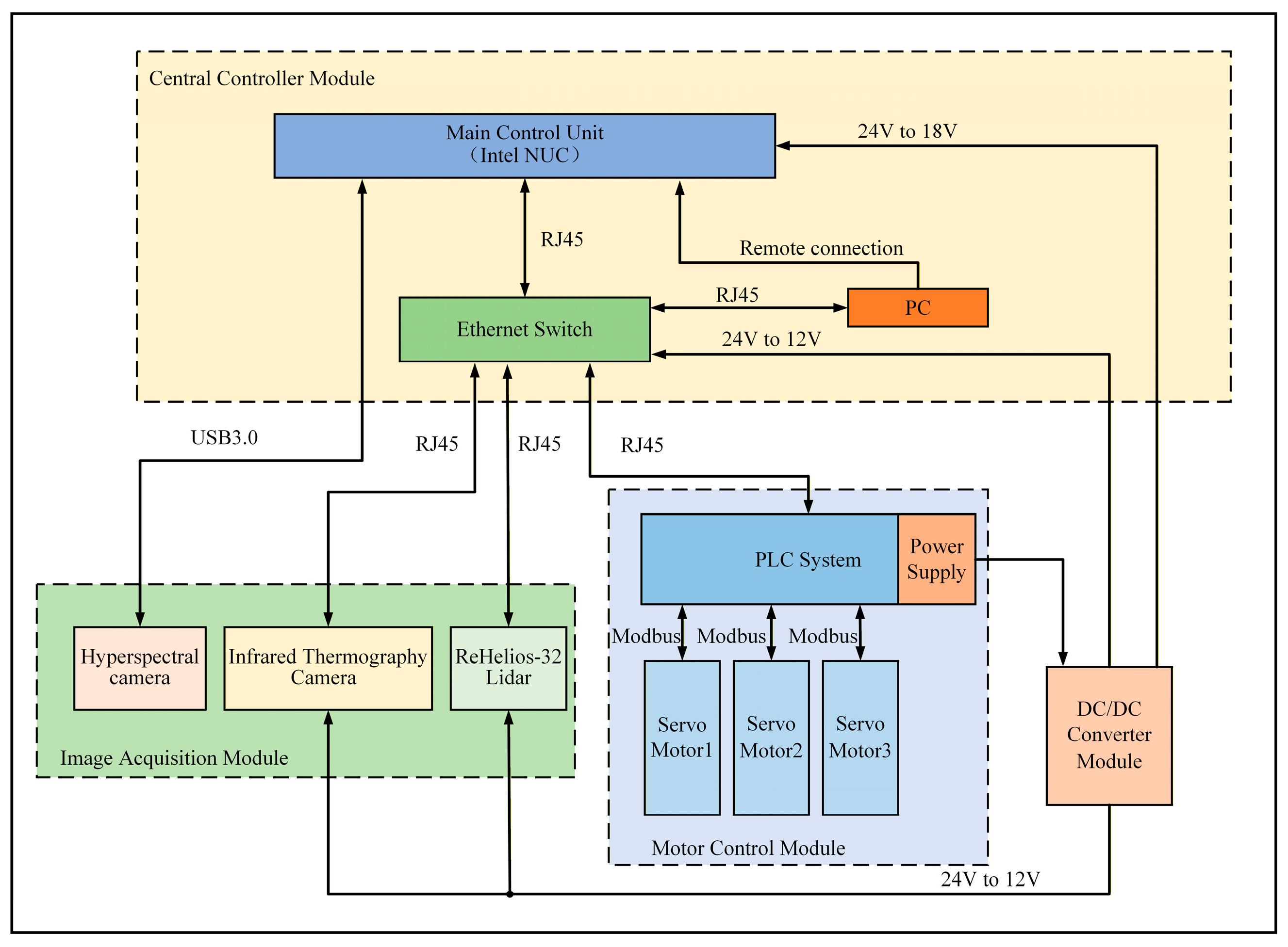 Part C contains the Intel NUC10FNH industrial-grade computer (Intel Corporation, Santa Clara, CA, USA), which serves as the phenotyping platform’s central control unit. This unit orchestrates the platform’s motion control, manages sensor operations, and executes real-time data acquisition and processing. A schematic of the control system architecture is shown in