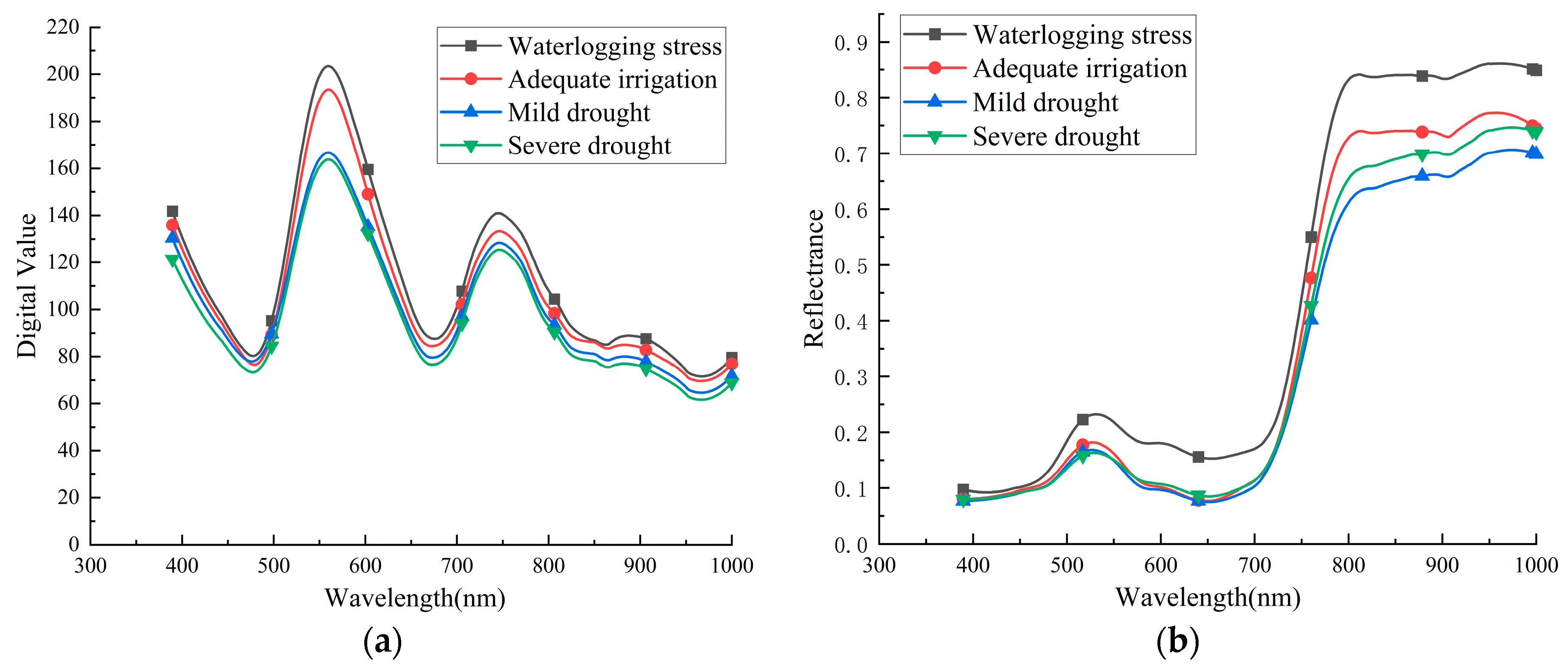 Figure 9). The spectral curves of plant canopies under different degrees of water stress before and after treatment are shown in