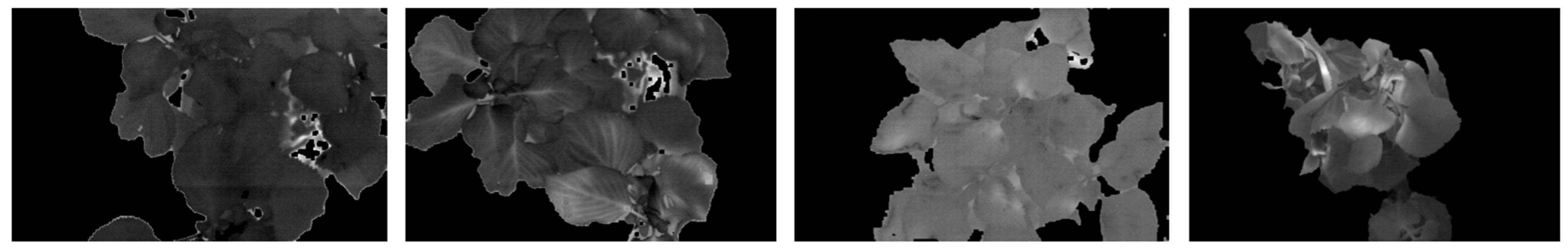 Raw data from the platform’s multiple sensors included substantial background interference from soil surfaces, pot edges, and imaging artifacts. To address these issues, we developed a preprocessing pipeline in Python 3.8 with OpenCV and the Point Cloud Library (PCL). Each sensor type required custom processing workflows to eliminate noise and isolate canopy regions. The resulting aligned datasets provided a solid foundation for extracting phenotypic features relevant to water stress analysis.
