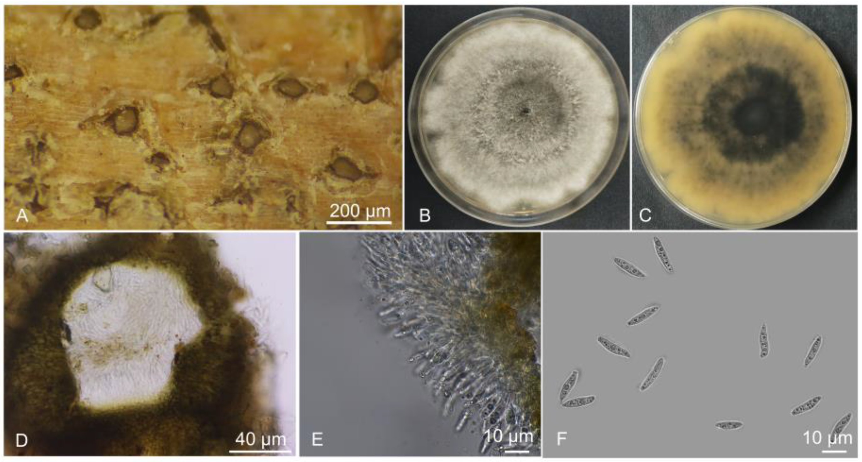 - Lin, L.; Bai, Y.; Pan, M.; Tian, C.; Fan, X. Morphology and molecular analyses reveal three new species of Botryosphaeriales isolated from diseased plant branches in China. MycoKeys 2023, 97, 1–19. [Google Scholar] [CrossRef]