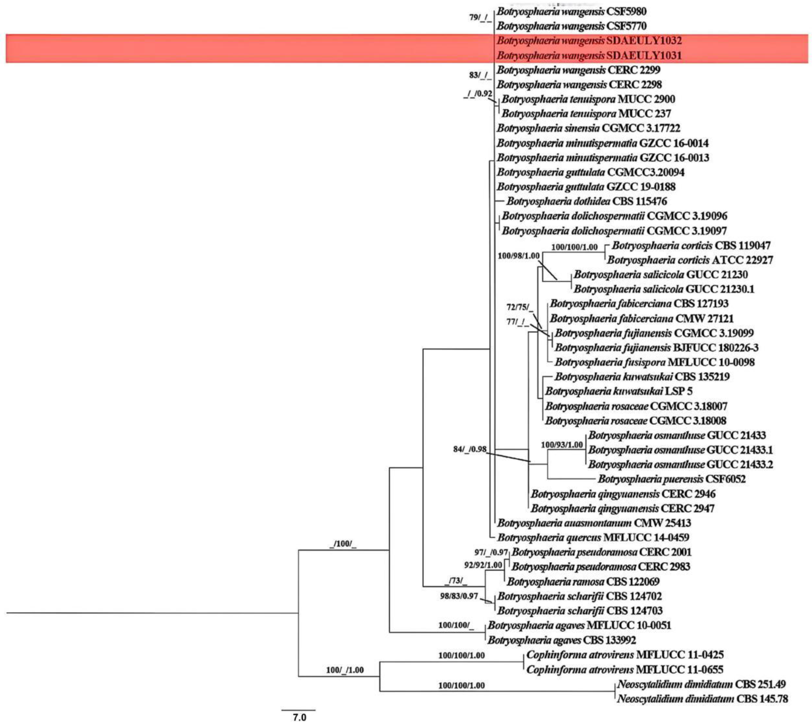 - Wang, C.; Liu, L.; Liu, Y.; Wu, Z.; Li, C.; Pan, H. First report of Botryosphaeria dothidea causing leaf blight on Aesculus chinensis. J. Phytopathol. 2025, 173, e70085. [Google Scholar] [CrossRef]