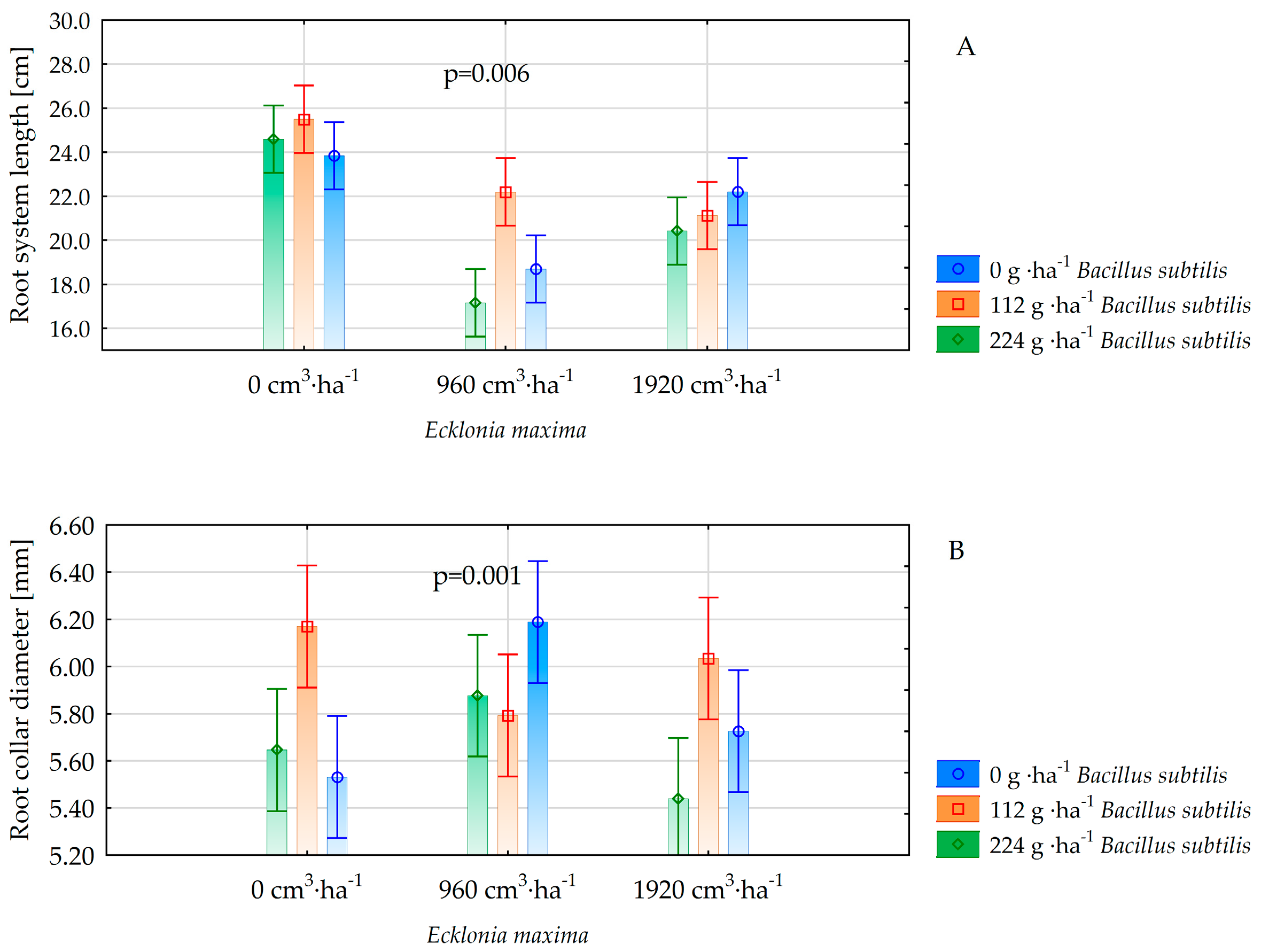 | Root collar diameter [mm] | 5.78 ± 0.4 a | 5.95 ± 0.3 a | 5.73 ± 0.6 a | 0.101 | 5.82 ± 0.4 b | 6.00 ± 0.4 a | 5.65 ± 0.6 b | 0.006 |