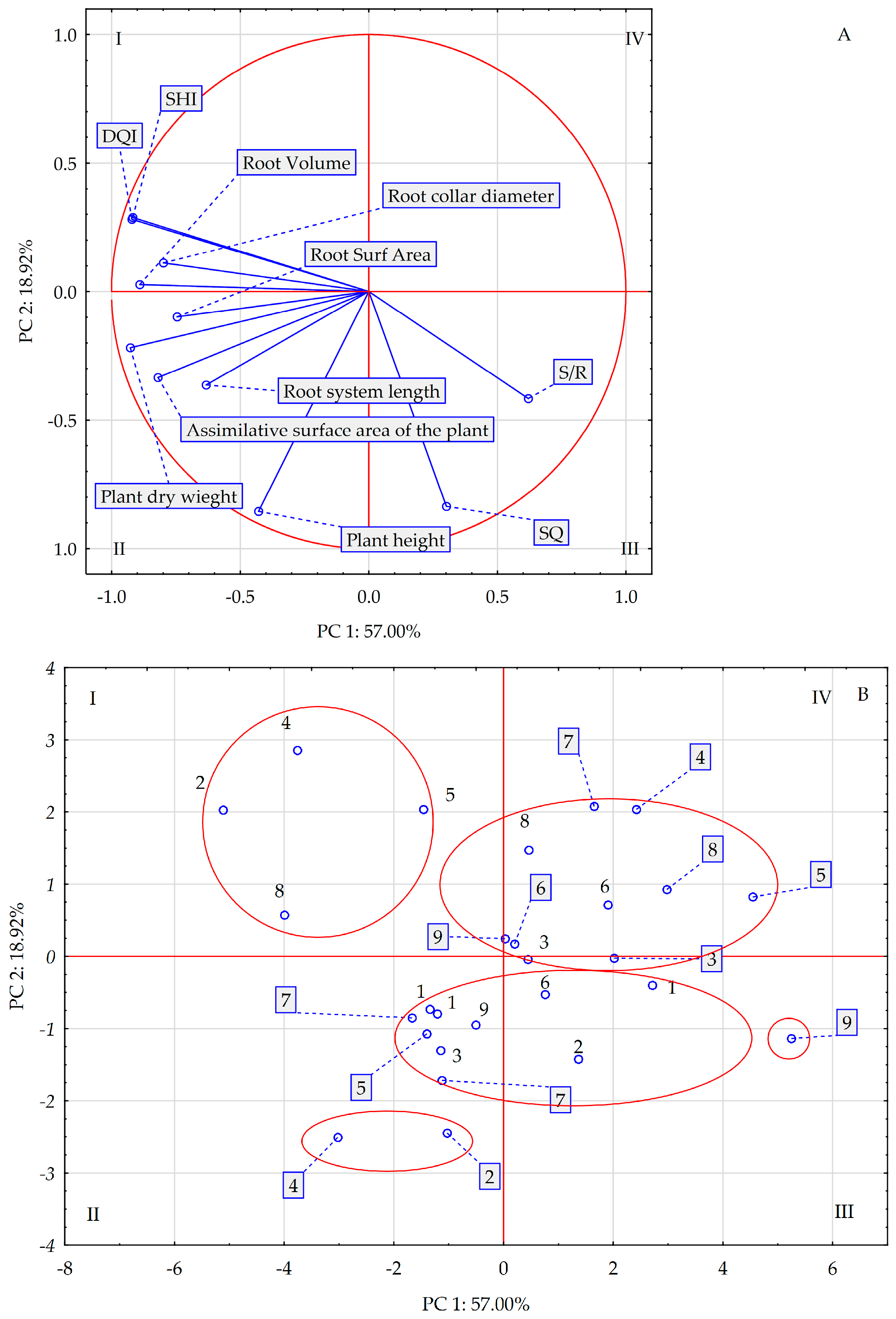 | Root system area [cm2] | 99.1 ± 15.2 ab | 101.0 ± 17.8 a | 87.4 ± 16.2 b | 0.024 | 109.4 ± 21.7 a | 92.4 ± 21.4 b | 85.7 ± 7.34 b | 0.000 |
