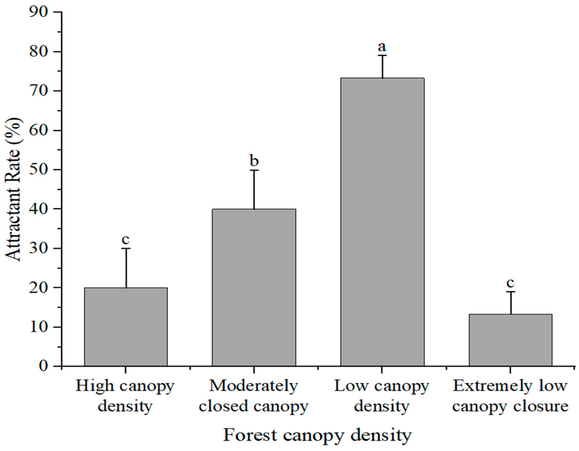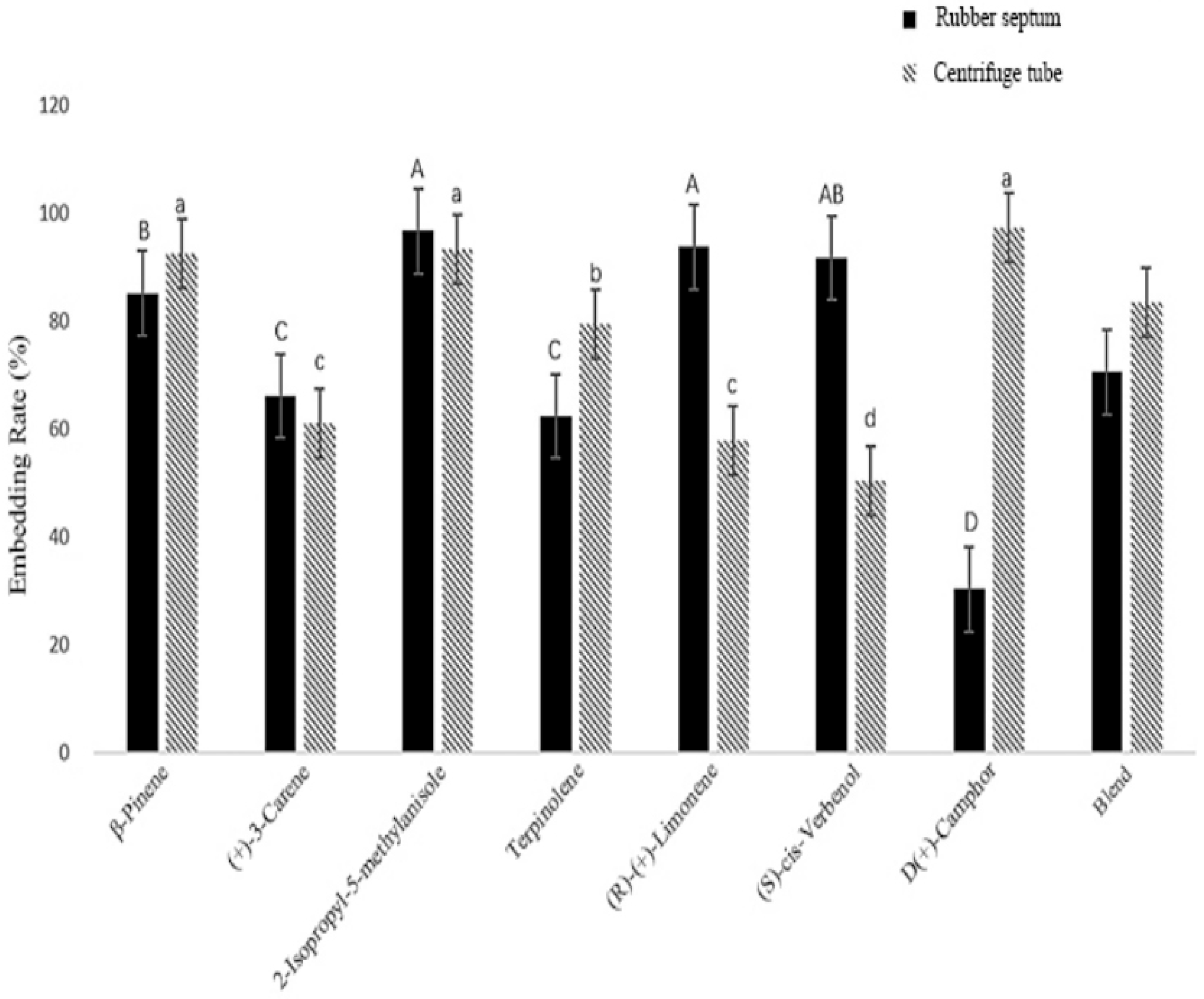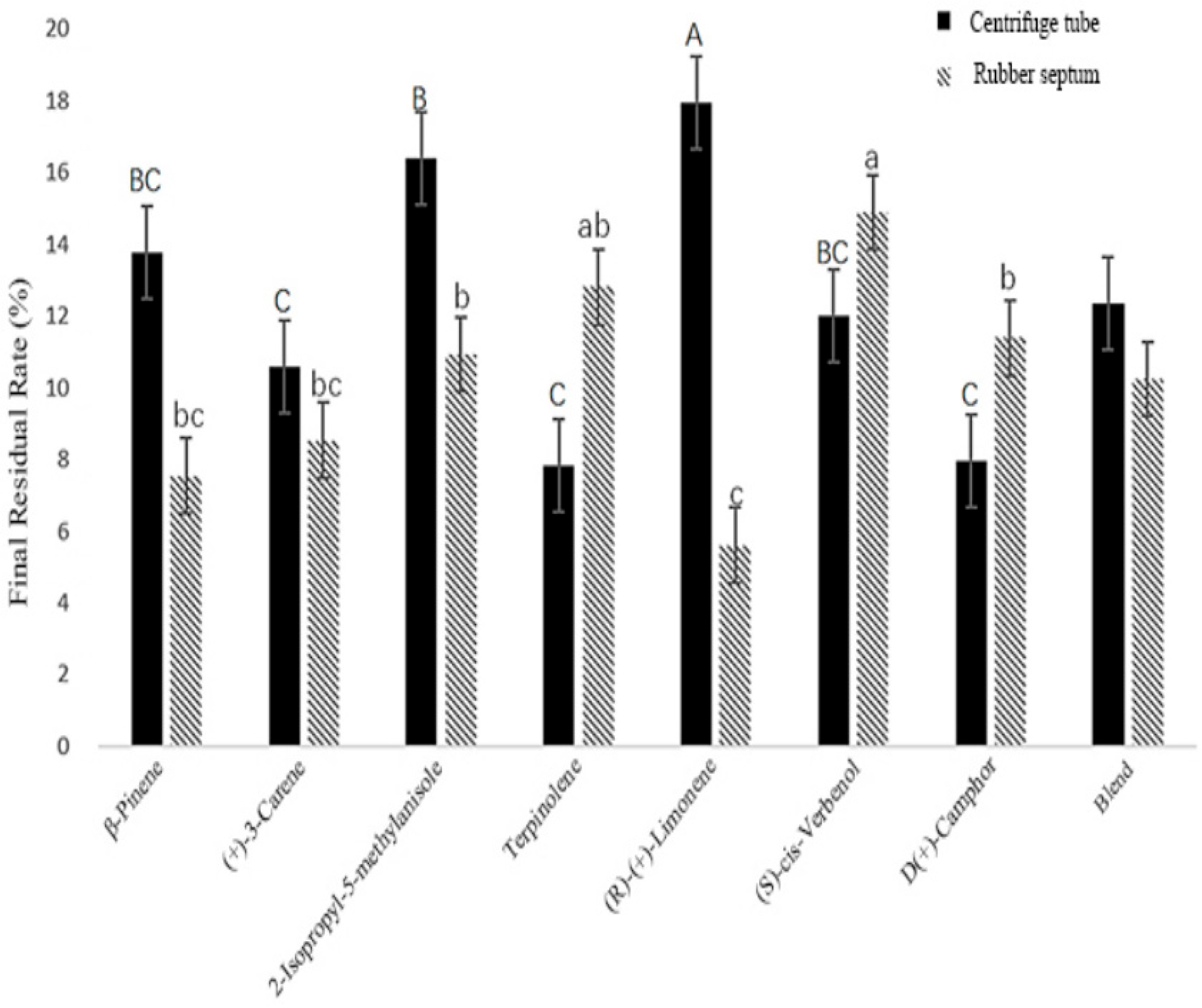 | 1 | 10 μg/μL β-Pinene + 10 μg/μL Terpinolene + 1 μg/μL 2-Isopropyl-5-methylanisole + 1 μg/μL D(+)-Camphor + 100 μg/μL (R)-(+)-Limonene + 1 μg/μL (+)-3-Carene | 40 ± 25 b | 67 ± 33 a | 17 ± 15 a |