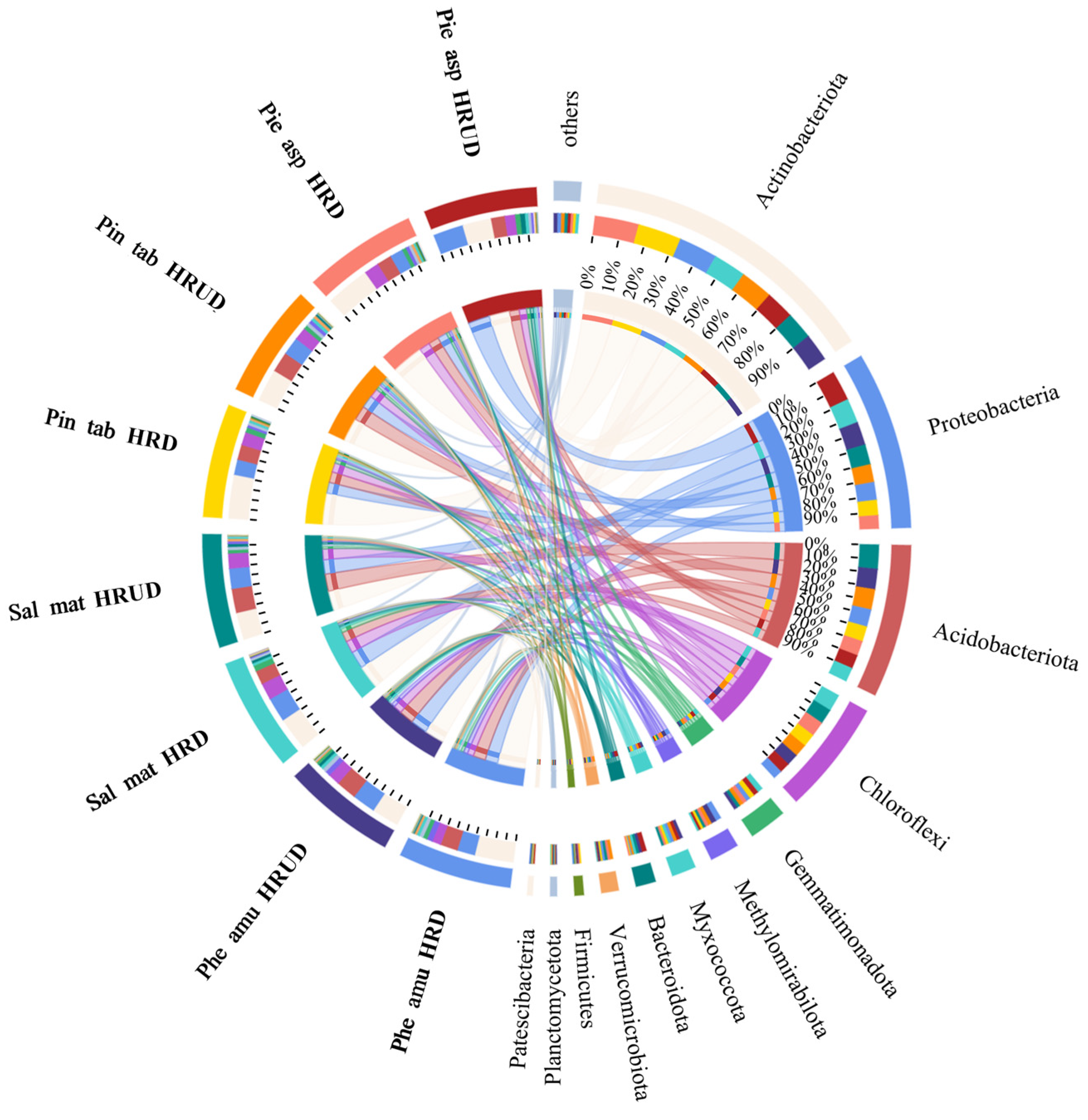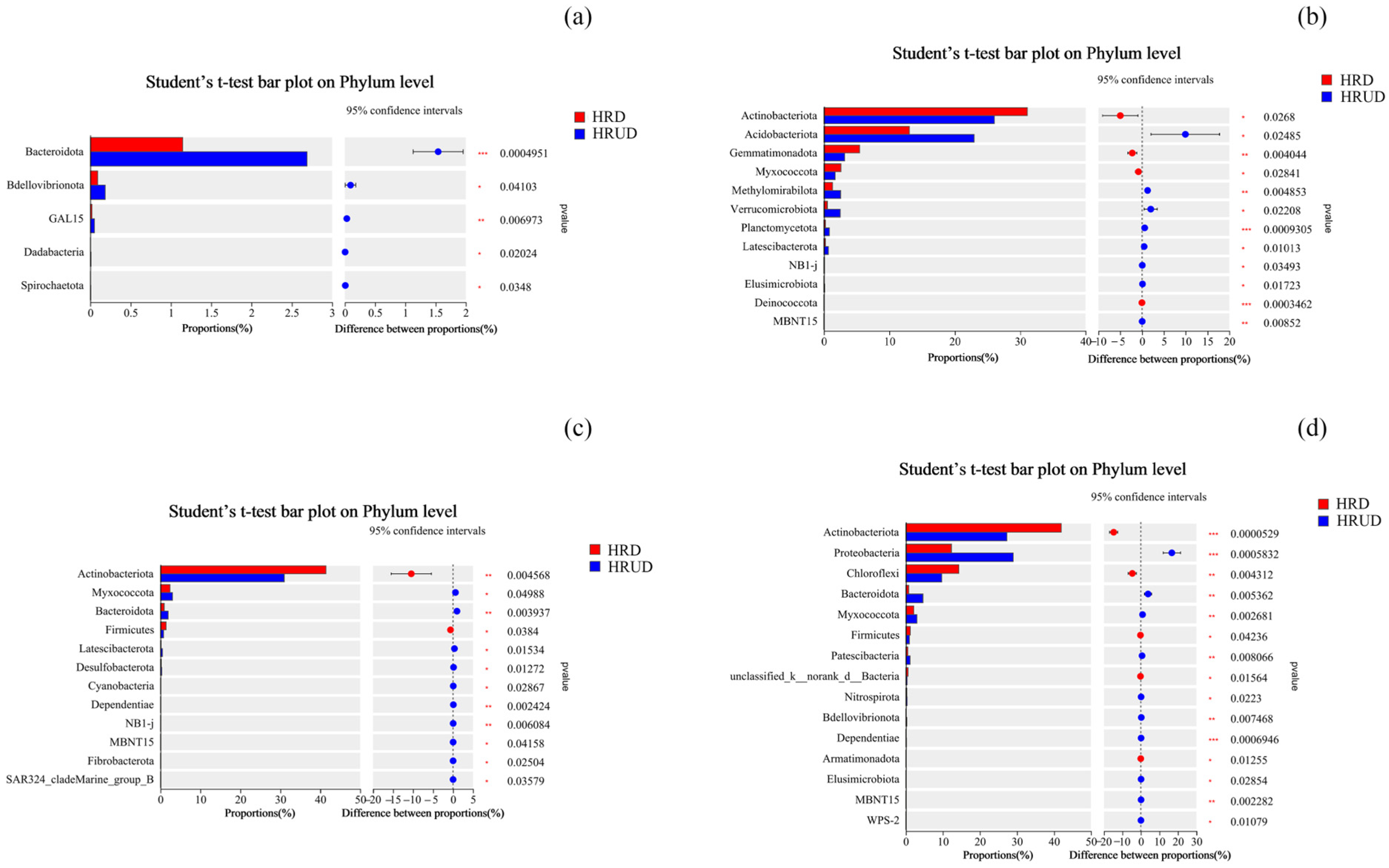 - Zhao, Y.H.; Luo, M.Y.; Zhou, Y.J.; Jia, X.; Kang, S.Z.; Yang, S.Y.; Mu, Q. Spatial patterns of dominant bacterial community components and their influential factors in the southern Qinling Mountains, China. Front. Microbiol. 2022, 13, 1024236. [Google Scholar] [CrossRef] [PubMed]