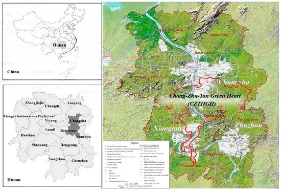 The Chang-Zhu-Tan Green Heart (CZTHGH) is located at the confluence of Changsha, Zhuzhou, and Xiangtan cities, covering an area of 522.87 km2 within the geographical coordinates of 27°43′29″ N to 28°05′55″ N and 112°53′32″ E to 113°17′42″ (Figure 1). As the world’s largest metropolitan green heart, its establishment originated from the strategic needs of China’s Two-Oriented Society pilot zone, with the core aim of preserving large-scale ecological space within the urban agglomeration, constructing structural green isolation barriers to curb urban sprawl, and safeguarding regional ecological security. This represents a spatial planning strategy for achieving sustainable development. To implement conservation measures, the green heart area has enforced stringent spatial controls in accordance with the Regulations on the Protection of the Ecological Green Heart Area in the Changsha–Zhuzhou–Xiangtan Urban Agglomeration of Hunan Province. It is categorized into prohibited development zones, restricted development zones, and controlled construction zones, all managed under provincial legislation and cross-city institutional coordination.