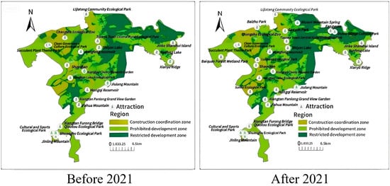 A temporal comparison reveals distinct shifts in the scale and composition of forest recreation nodes. Before 2021, the CZTHGH contained a relatively limited number of forest scenic spots, with a total of 21 viable recreation nodes. These were predominantly traditional sightseeing-oriented attractions, supplemented by a modest number of rural and theme parks. After 2021, the total number of nodes increased significantly to 28, accompanied by a notable transformation in their typological structure. New additions were primarily experiential in nature, including eco-camps, forest wellness bases, and nature education sites. A considerable number of socially oriented public parks—such as Sunhu Ecological Park and Dutou Village Cultural Ecological Park—also emerged, reflecting a broader shift in recreational supply from sightseeing-based to experience-oriented offerings. This expansion provided residents with a growing number of recreational spaces and enhanced the overall density of forest recreation sites. Spatially, the central region—largely designated as a prohibited or restricted development zone—remained largely free of forest scenic spots, indicating that the distribution of recreation nodes aligns closely with the functional zoning of the CZTHGH, with minimal tourism development occurring in core protected areas (Figure 3).