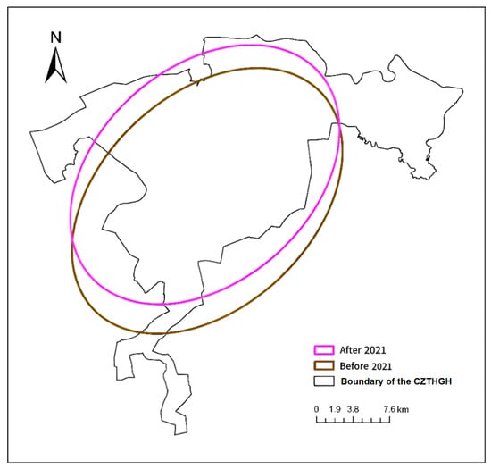 Overall, the spatial distribution within CZTHGH shows increasing geographical concentration, oriented predominantly along a northeast–southwest axis while gradually trending toward greater uniformity. Before 2021, CZTHGH was mainly distributed in the form of one main core + three secondary cores, with a total of 21 nodes. The concentration in the western region was stronger, while the eastern region was distributed as a separate area. This reflects that forest recreation sites were mainly concentrated in the western region, particularly in the southwestern area centered on Jinxia Mountain. The Standard Deviation Ellipse was located farther south, centered at (113.057713, 27.943291), with a long–short axis standard deviation difference of 0.047697, indicating a general northeast–southwest alignment. After 2021, the total number of nodes increased to 28, with enhanced centrality and a greater number of scenic spots. Kernel Density analysis revealed a shift to a distribution pattern featuring dual primary cores with multiple secondary cores, reflecting concurrent growth in node quantity and spatial distribution optimization. It was also observed that parts of the eastern area consistently remained vacant, corresponding to the Intercity Ecological green heart area, which functions as an ecological barrier for CZTHGH, is designated primarily for protection, and is excluded from development. As a result, no relevant data were recorded in this zone. The Standard Deviation Ellipse shifted northward, with its center moving to (113.05559, 27.967816) and the axis standard deviation difference decreasing to 0.043057, while the directional distribution remained consistent with that before 2021. These changes indicate that forest recreation point distribution has become more uniform after 2021. The results derived from the Standard Deviation Ellipse are consistent with those obtained from recreational site distribution and Kernel Density analyses (Figure 5).