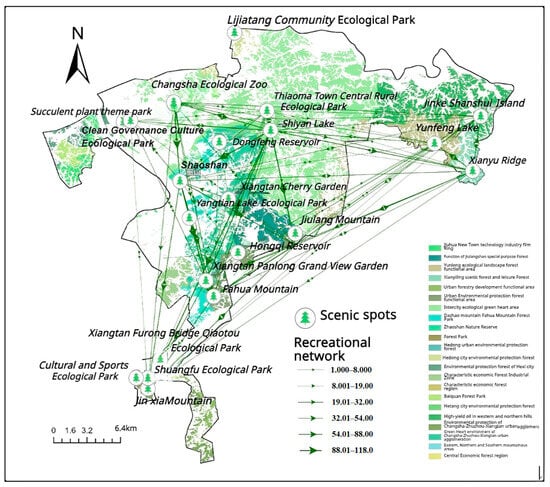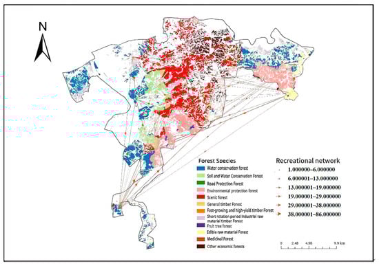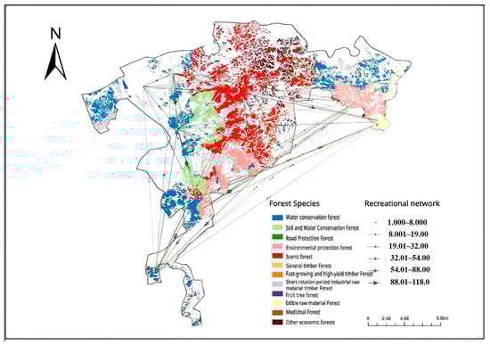The existing research results on forest recreation networks mainly focus on forest landscape ecological networks and recreation networks. Although a certain accumulation has been formed, there are still certain research biases and gaps. In the field of forest landscape ecological network research, existing achievements mainly focus on high-grade forest resources or ecological conservation functions [], determining nodes through patches and studying the boundary relationships between nodes. The node definition mainly includes ecological attributes such as patch area [], patch coordinates, patch productivity [], or population size [], selecting patches with high ecological service functions such as water bodies, forests, and nature reserves as source patches, and constructing an indicator system to evaluate the importance of patches. The edges were measured using geographic connections between patches [] and the size of edge effects [], and were calculated using methods such as Euclidean distance and least cumulative cost distance (LCP) []. GIS spatial analysis methods, landscape ecological analysis methods, and spatial pattern analysis methods were used to study regional vegetation patterns, landscape ecological patterns, and forest landscape patterns. The overall focus is on analyzing the suitability and conservation value of forest landscapes from an ecological perspective, with a particular emphasis on analyzing network connectivity from the perspective of forest spatial landscape structure. There is less consideration given to the functional relationships of networks, especially the forest recreational functions of daily landscapes and the service value of universal recreational activities.