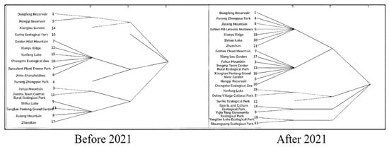 Regarding betweenness centrality, before 2021, Hongqi Reservoir, Changsha Ecological Zoo, Shiyan Lake, Jiulang Mountain, and Zhaoshan Mountain ranked highest, indicating their strong hub function. In contrast, the betweenness centrality of Succulent Plant Theme Park, Jinxia Mountain, Xianyu Ridge, Dongfeng Reservoir, Xiangtan Cherry Blossom Garden, Furong Zhongyue Park, and Sunhu Ecological Park was zero, implying negligible intermediary function and limited visitor stay. After 2021, Jinxia Mountain, Jiulang Mountain, Tiaoma Town Central Rural Ecological Park, Changsha Ecological Zoo, and Shuangyong Ecological Park exhibited the highest betweenness centrality, reflecting their sustained role as key hubs. Among these, Changsha Ecological Zoo maintained its leading position, continuing to leverage its distinctive animal-oriented appeal. By comparison, Yunfeng Lake, Dutou Village Cultural Park, Sunhu Ecological Park, Yangtian Lake Ecological Park, Furong Zhongyue Park, Lijiatang Community Ecological Park, and Cultural and Sports Ecological Park all recorded zero betweenness centrality, indicating minimal intermediary function and low visitor retention, and thus a limited presence within the overall recreation network.