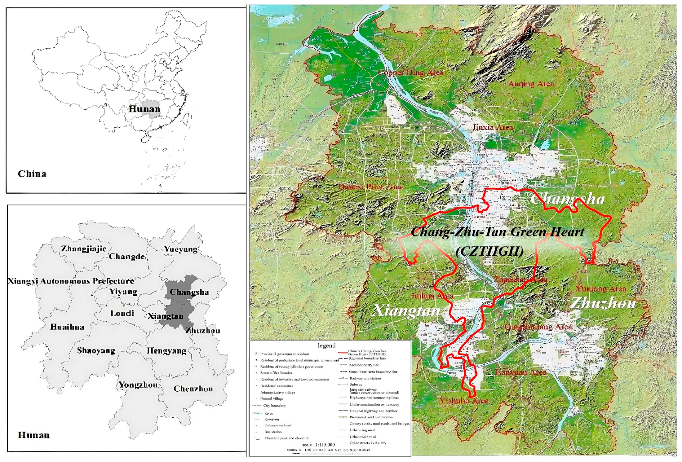5]. In recreational planning, the green heart area, by virtue of its large-scale and near-natural characteristics, is regarded as a strategic resource for providing high-quality and inclusive recreational services. It represents a key area for meeting residents’ escalating ecological, cultural, and health needs. The Chang-Zhu-Tan Green Heart (CZTHGH), spanning 522.87 square kilometers and recognized as the world’s largest urban ecological green heart, serves as a flagship demonstration zone for China’s dual carbon goals. With its diverse forest land types and positioning as a world-class ecological green heart, it provides high-quality forest recreation and shared space for residents across the three cities.