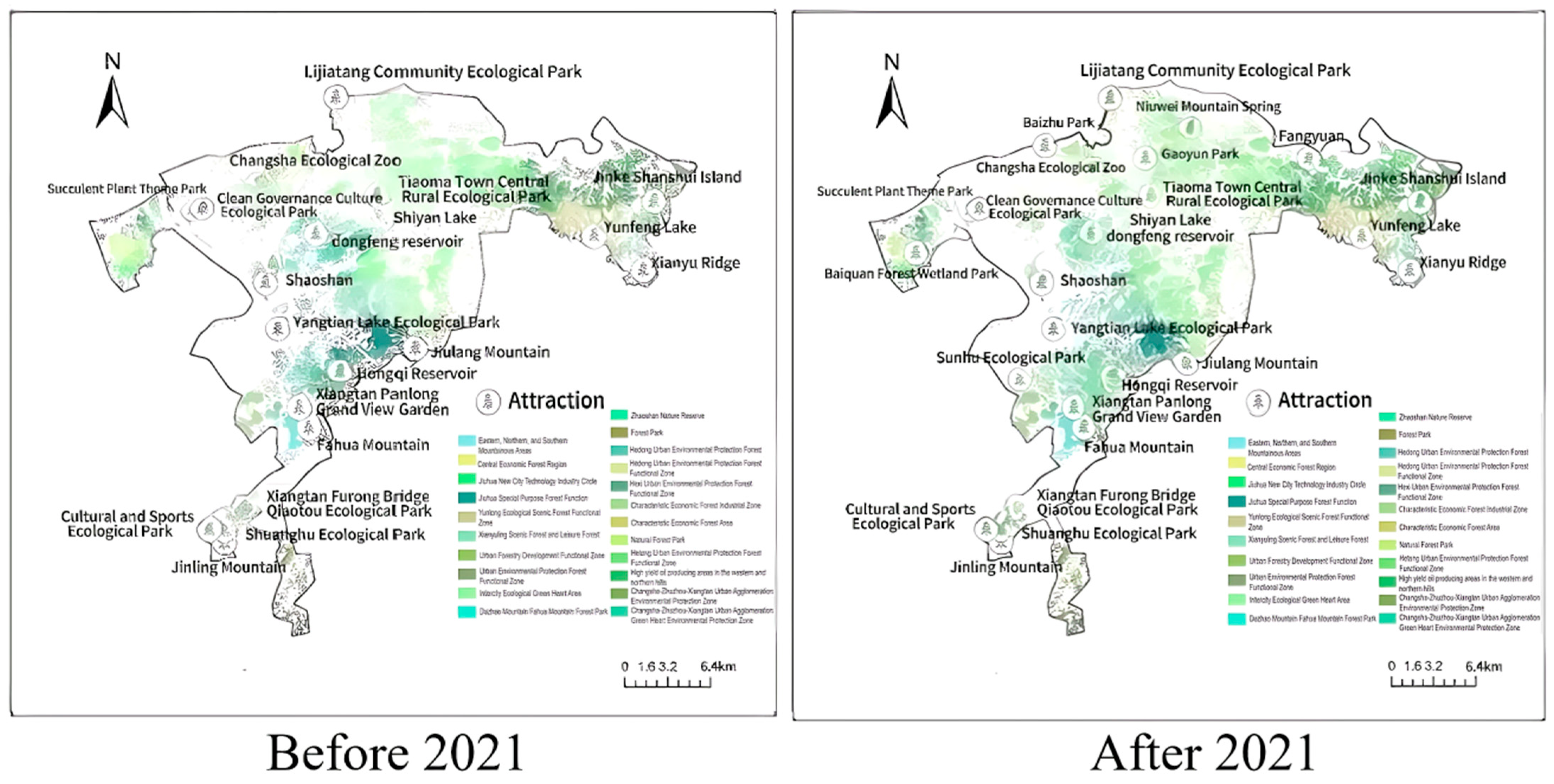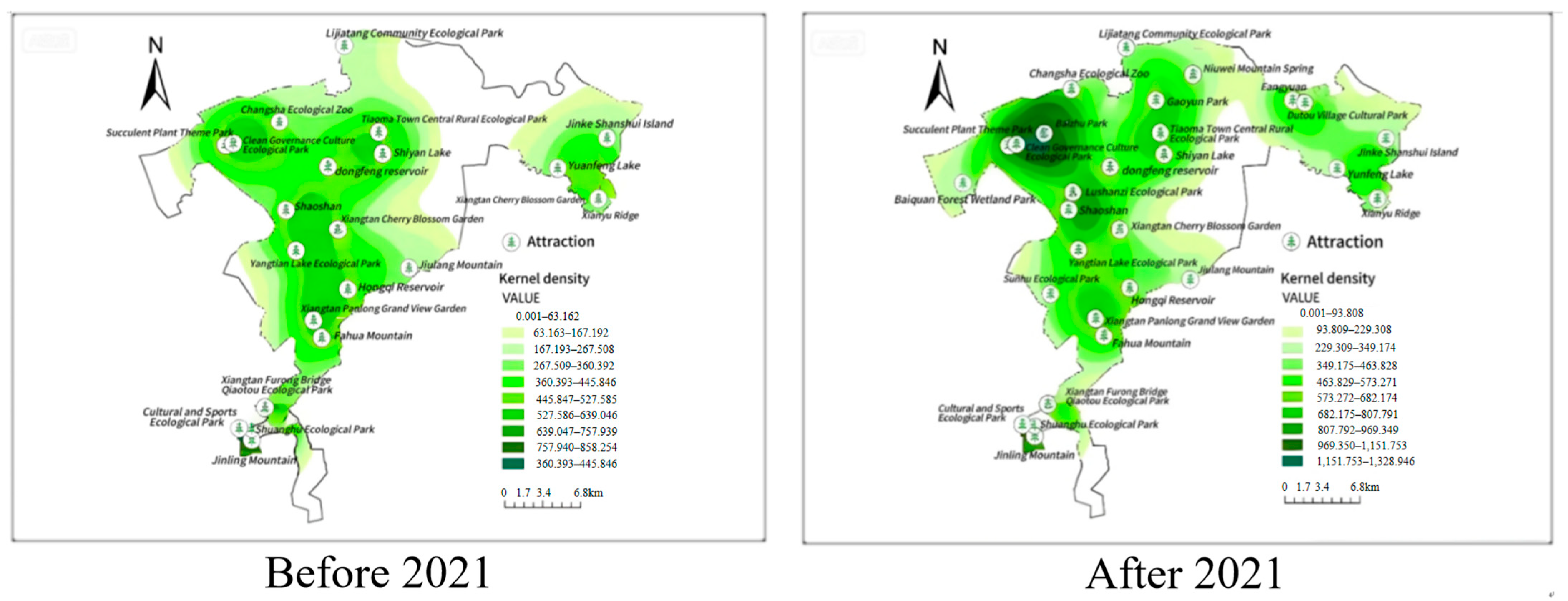 Moreover, due to limited access to historical POI data, this comparative analysis primarily relied on a POI-based recreation node database comprising major sites such as national-level scenic areas, provincial-level key rural tourism destinations, wetland parks, and forest parks. Given the shifts in recreational behavior following CZTHGH’s policy transitions and major health-related events, only the year 2021 was selected as the comparison time point. Future studies should incorporate POI data across all tourism categories, not solely forest recreation nodes, to improve the validity of recreation network analysis.