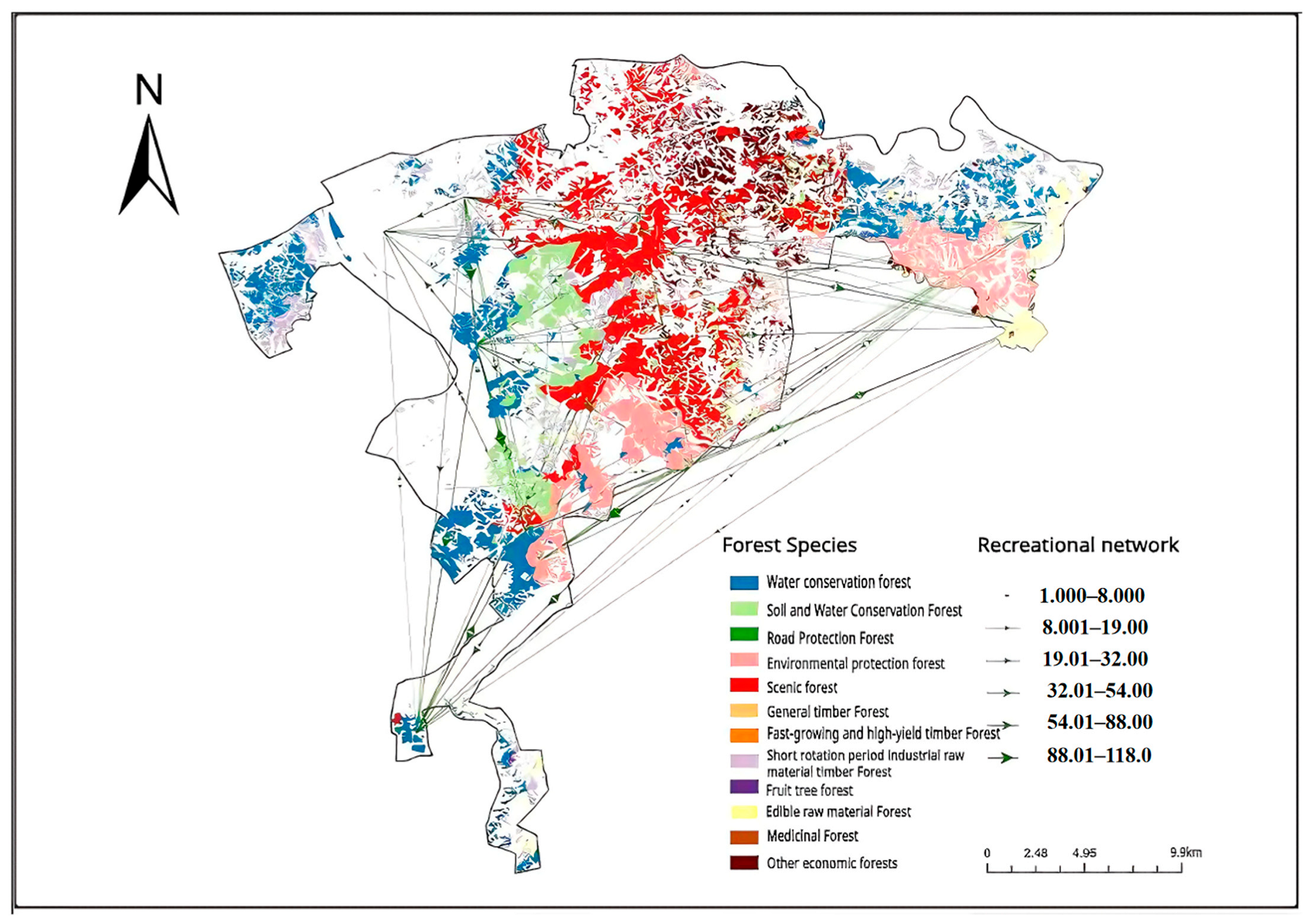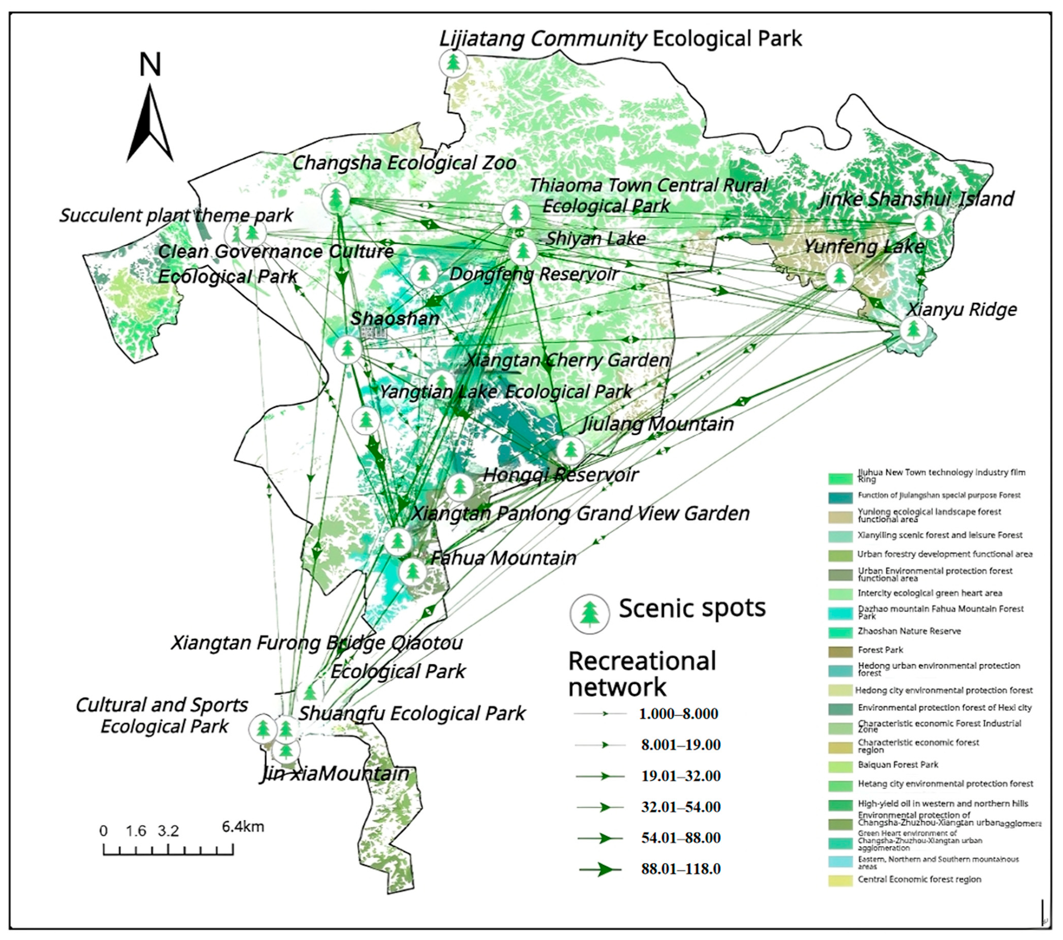 13]. GIS spatial analysis methods, landscape ecological analysis methods, and spatial pattern analysis methods were used to study regional vegetation patterns, landscape ecological patterns, and forest landscape patterns. The overall focus is on analyzing the suitability and conservation value of forest landscapes from an ecological perspective, with a particular emphasis on analyzing network connectivity from the perspective of forest spatial landscape structure. There is less consideration given to the functional relationships of networks, especially the forest recreational functions of daily landscapes and the service value of universal recreational activities.