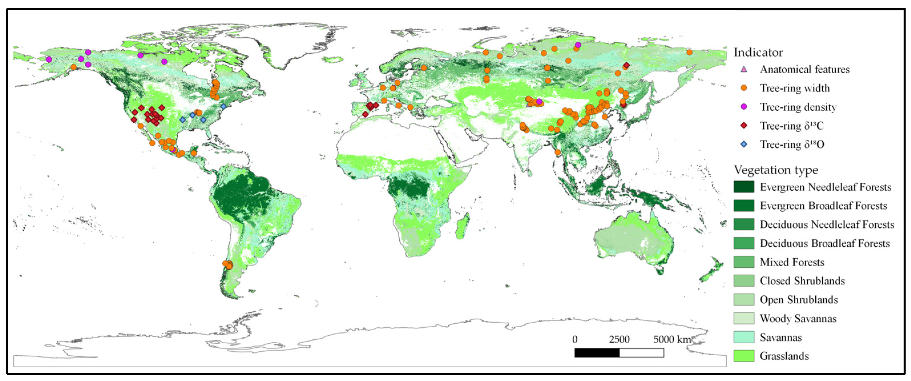 - Levesque, M.; Andreu-Hayles, L.; Smith, W.K.; Williams, A.P.; Hobi, M.L.; Allred, B.W.; Pederson, N. Tree-Ring Isotopes Capture Interannual Vegetation Productivity Dynamics at the Biome Scale. Nat. Commun. 2019, 10, 742. [Google Scholar] [CrossRef]