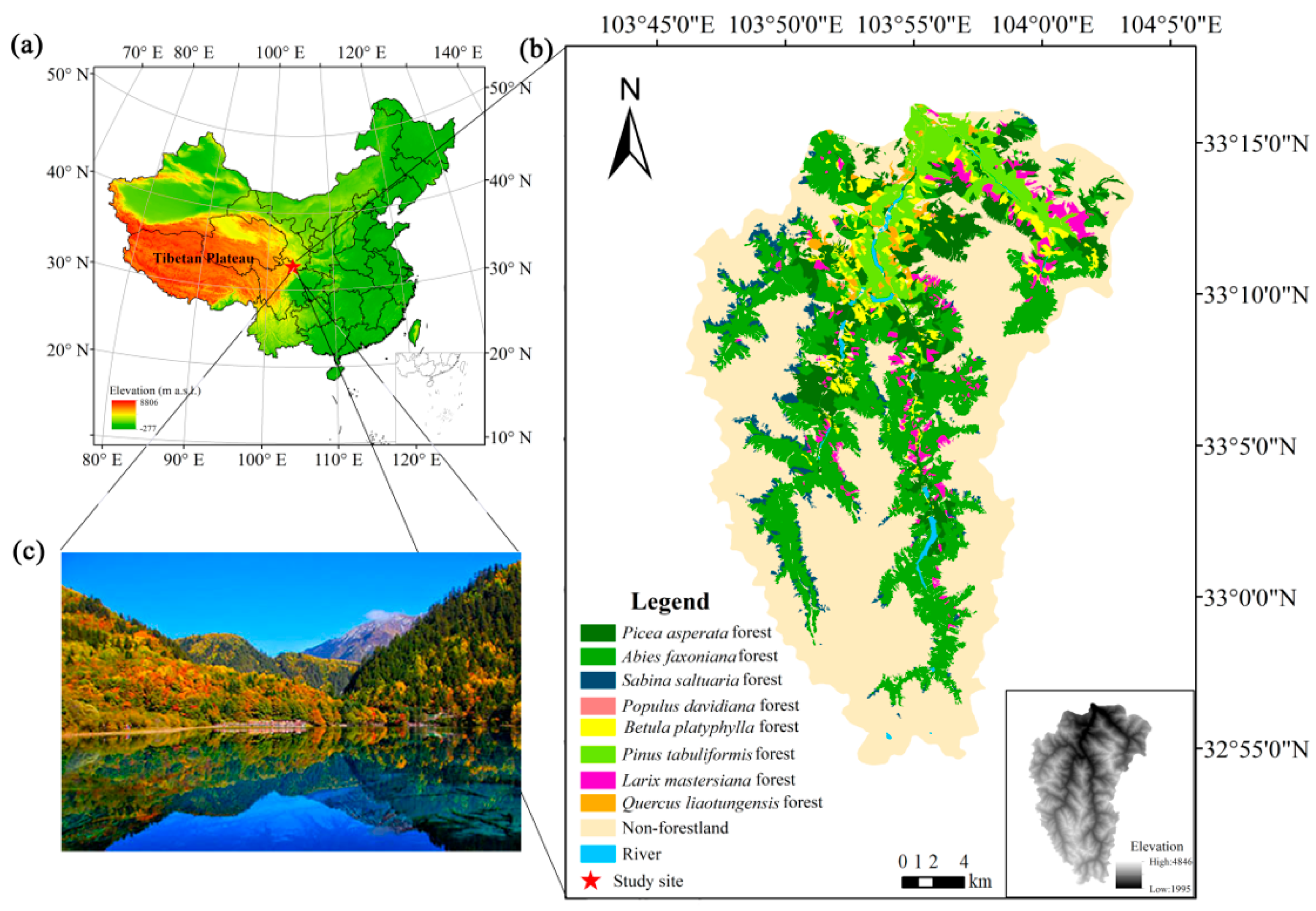 Liu, J.; Du, J.; Zhang, C.; Bachelot, B.; Yang, Y.; Dong, T.; Wu, Y. Landscape Aesthetics Quality in Subalpine Forests of Eastern Tibetan Plateau Will Greatly Decrease by the End of the Century? Forests 2025, 16, 1804. https://doi.org/10.3390/f16121804