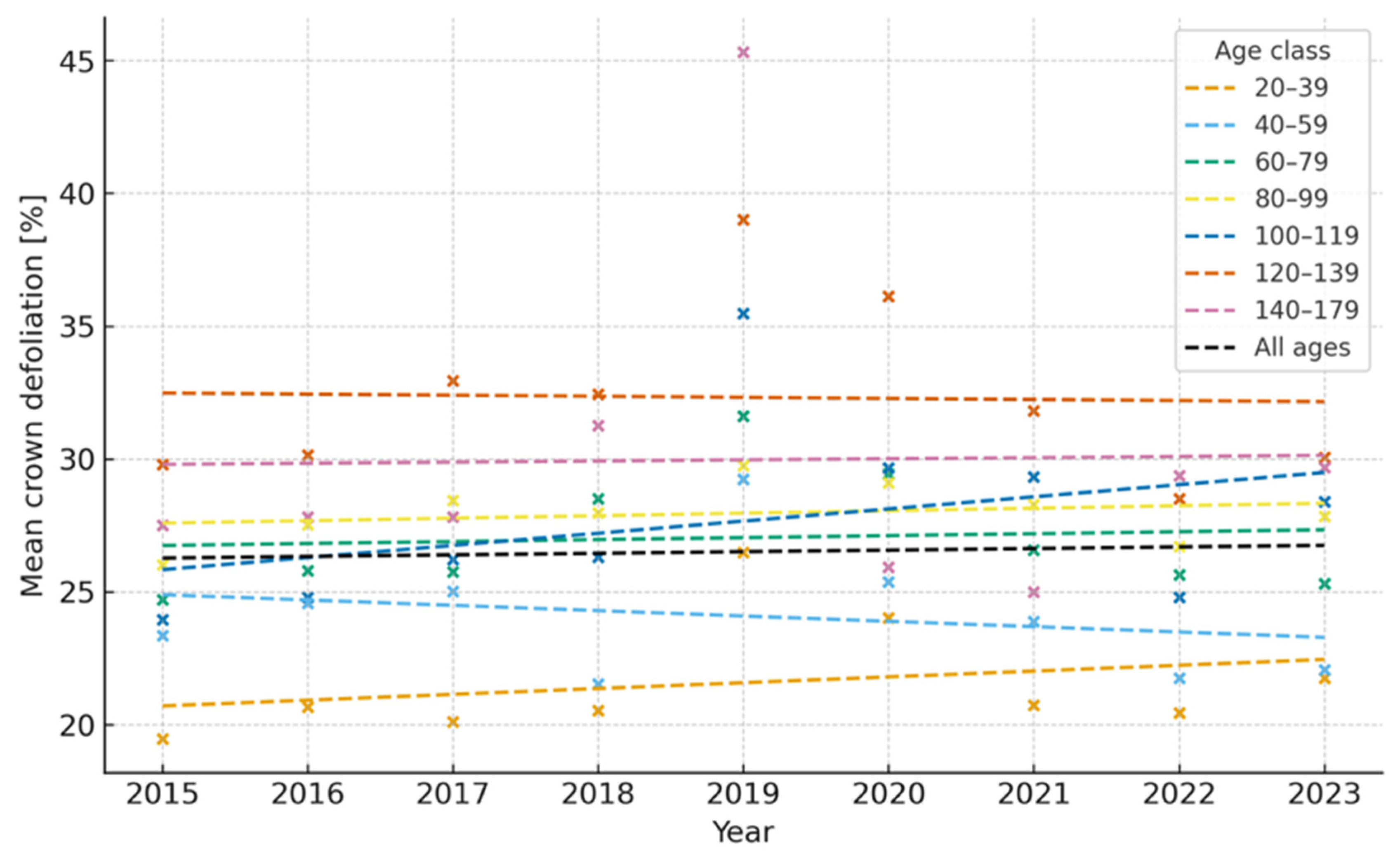 - Chief Inspectorate of Environmental Protection (GIOŚ). Reports on the Health Condition of Forests in Poland. Available online: https://monlas.gios.gov.pl/wyniki/raporty-o-stanie-zdrowotnym-lasow (accessed on 29 October 2025).