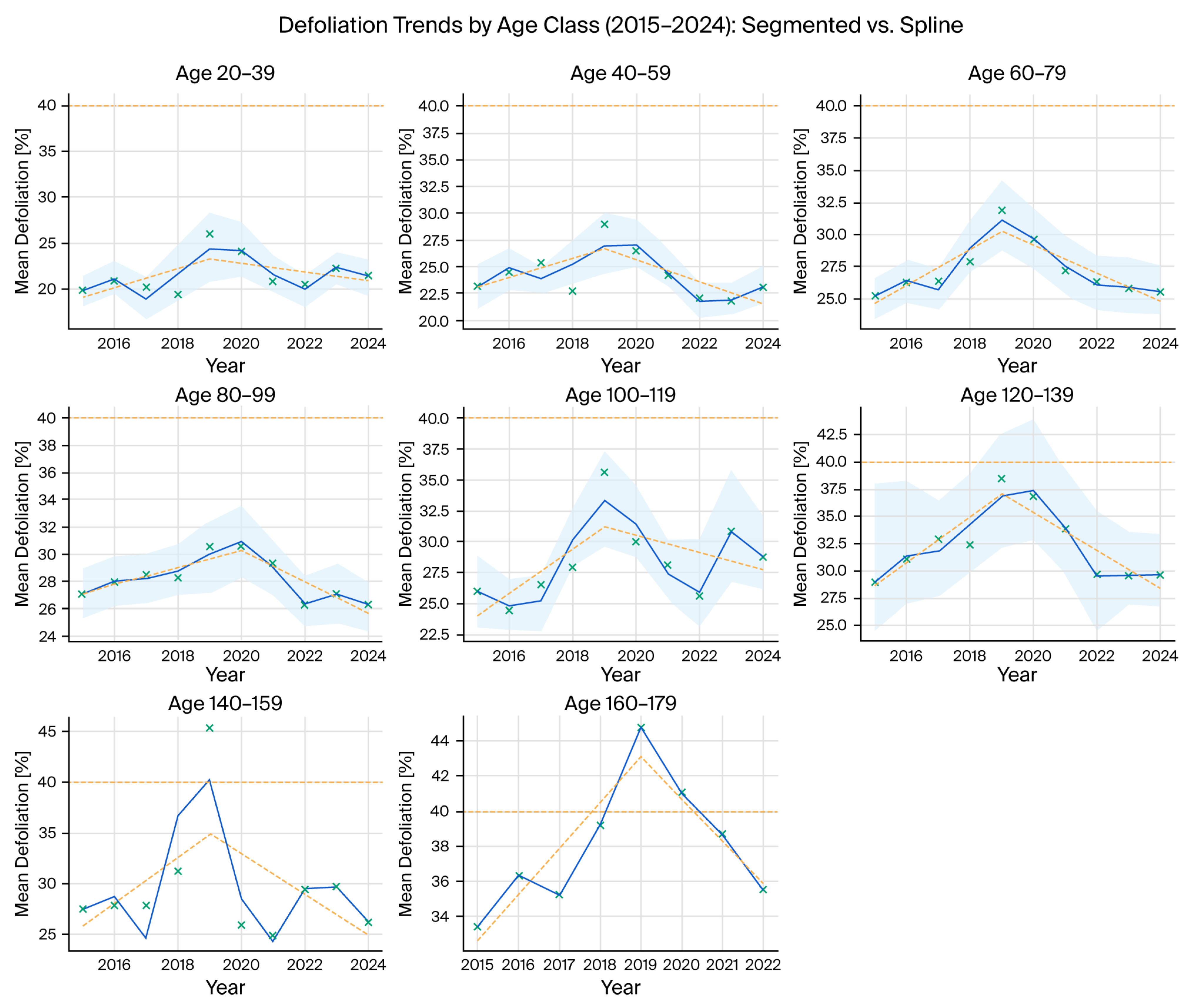 | Year | Mean Defoliation (%) | Change vs. Previous Year (pp) | Statistical Significance |