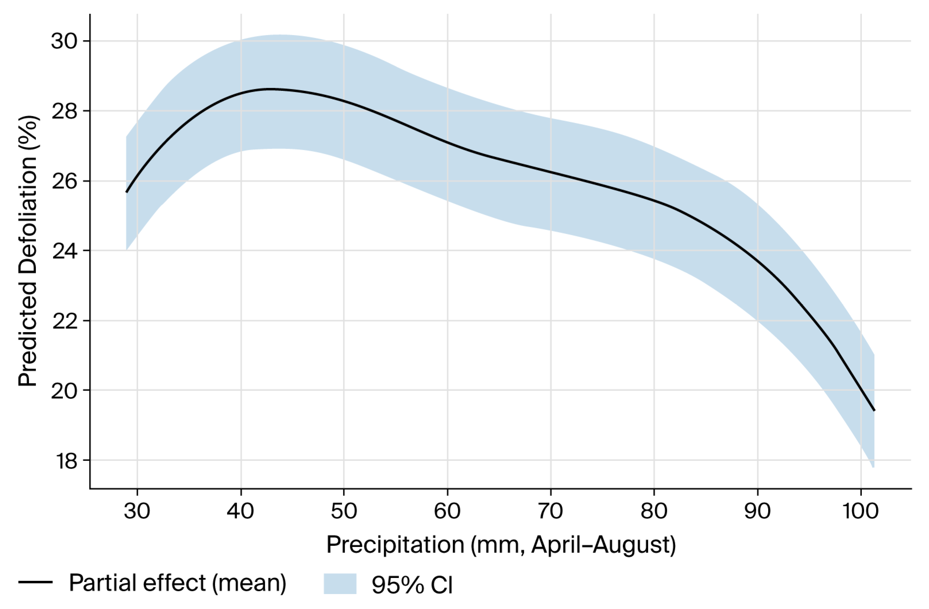 | Year | Number of Plots (N) | Mean Defoliation (%) | Mean Precipitation (mm) | Pearson Correlation (r, Defoliation–Precipitation) |