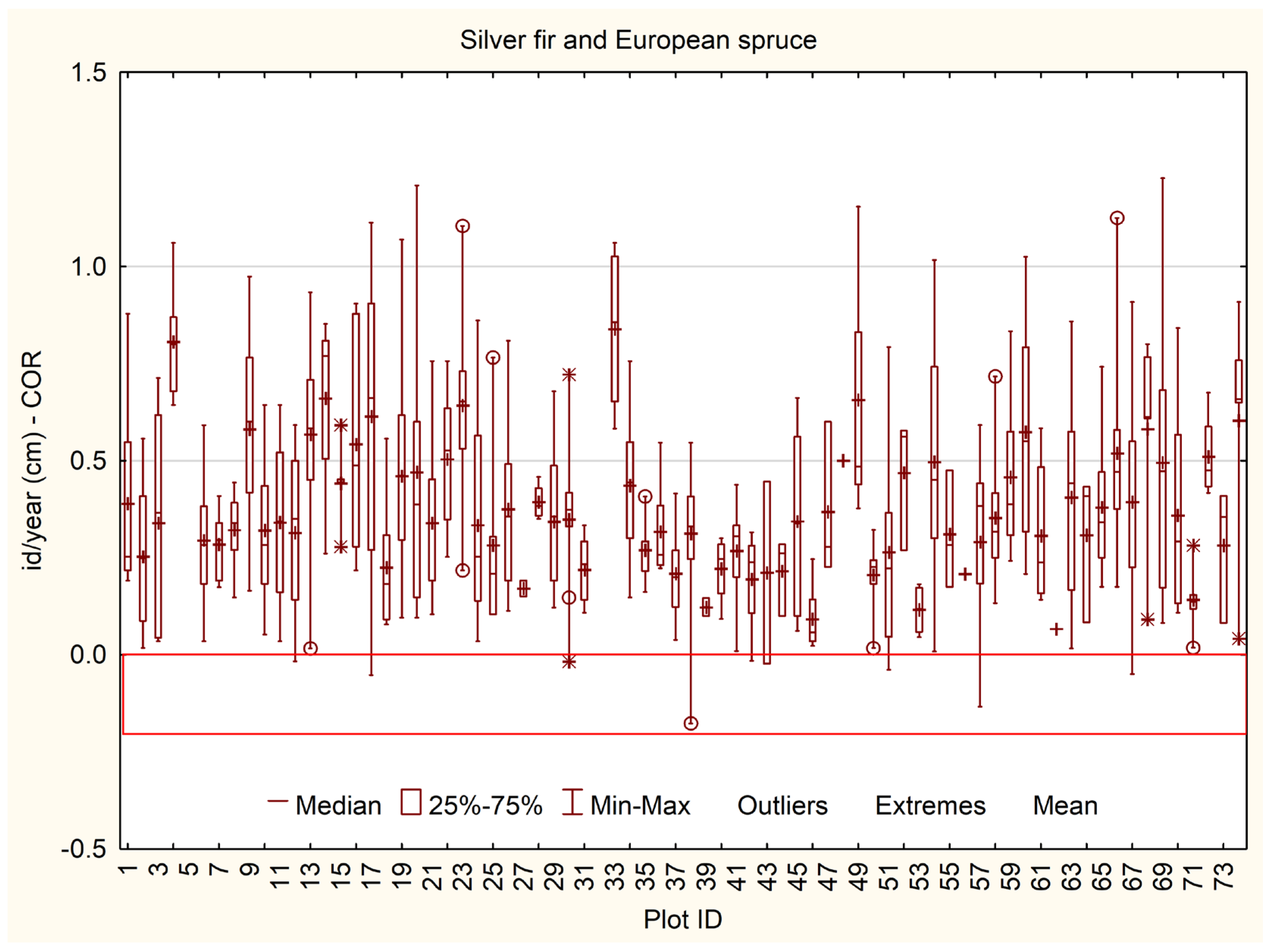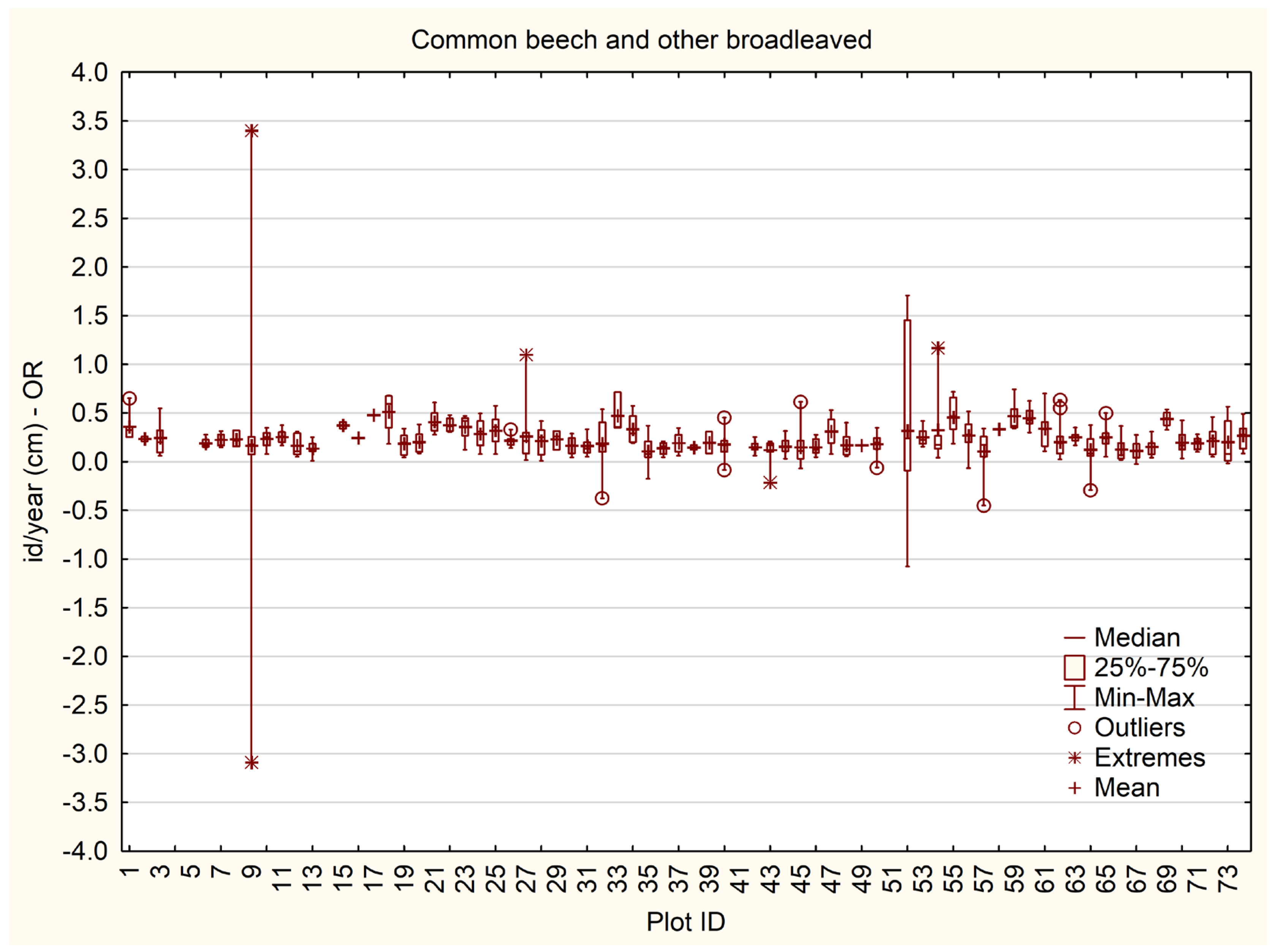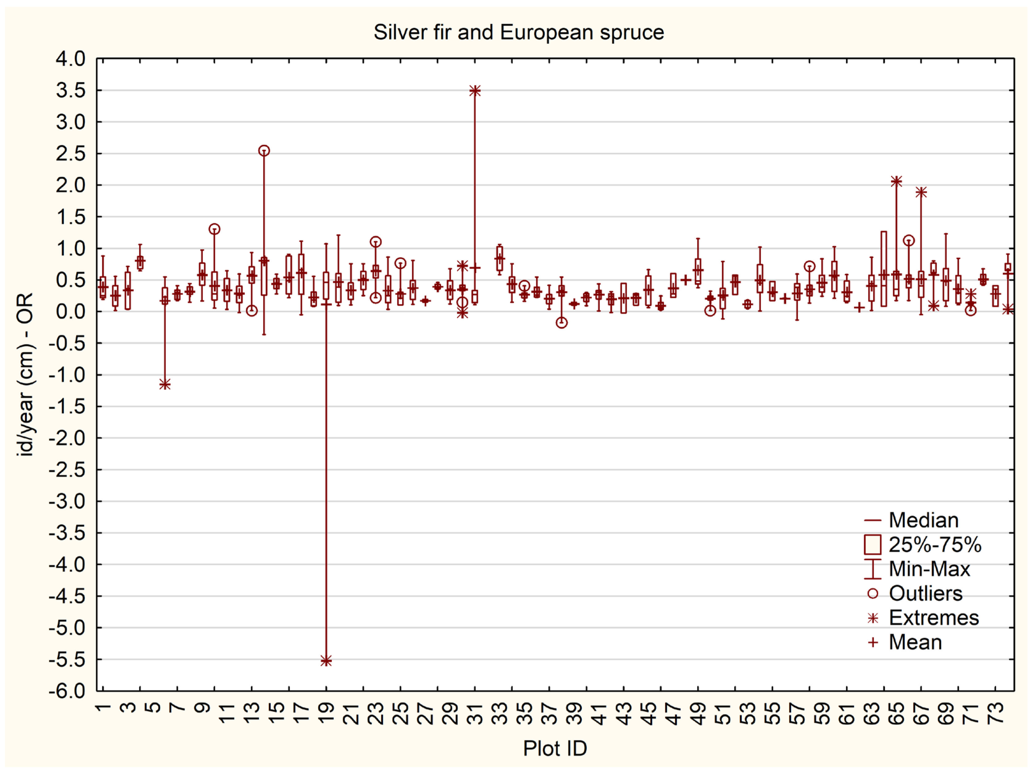 - High or low competition pressure on some plots, resulting in a below- or above-average increment of all trees on the plot, as presented in Figure 3. In these cases, data was considered as valid and retained without correction.