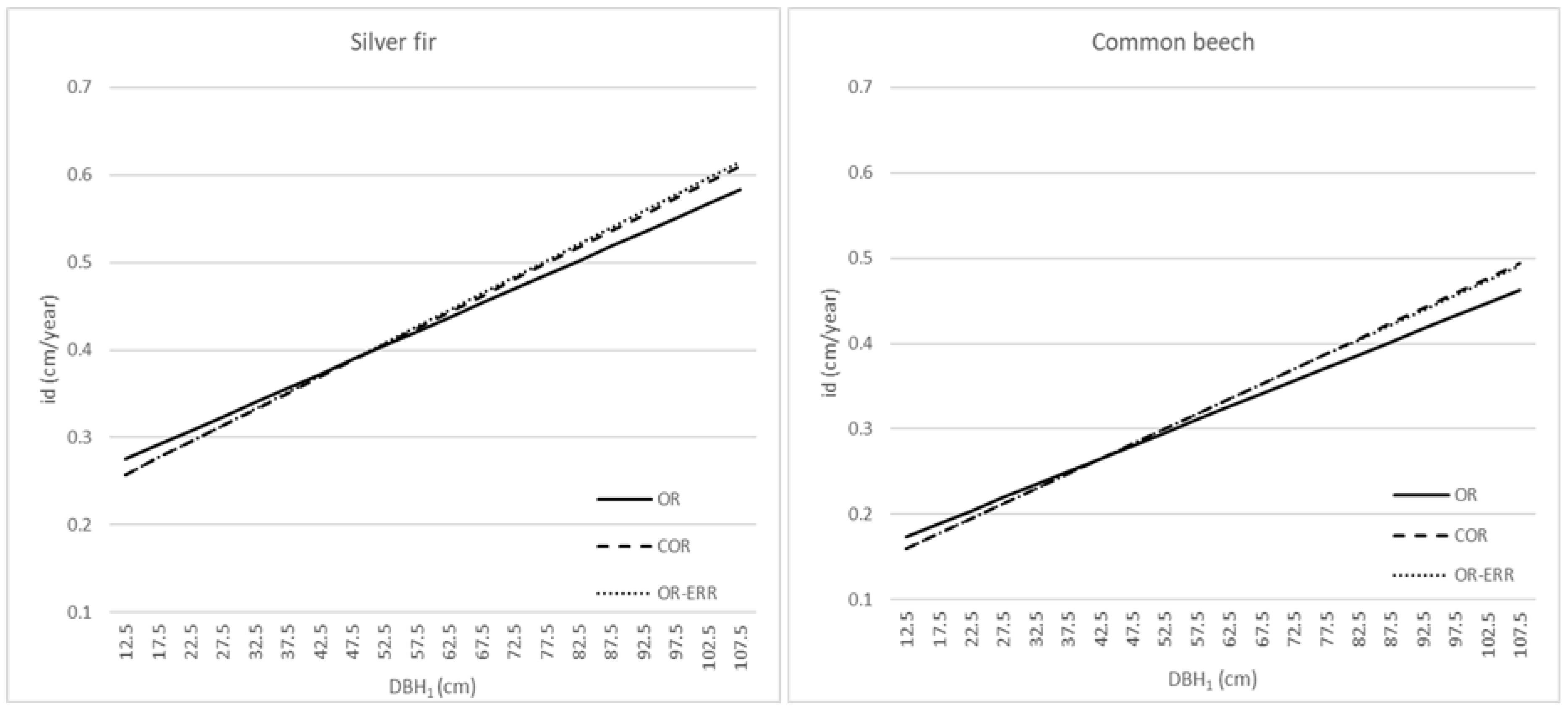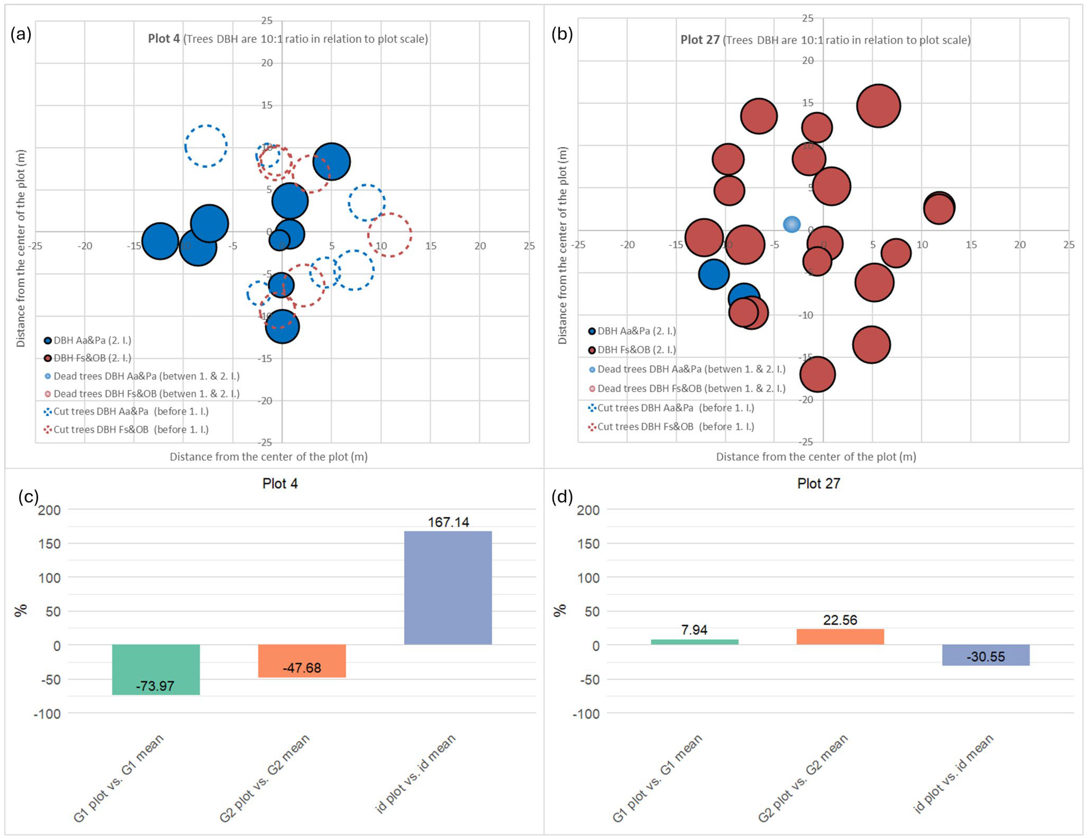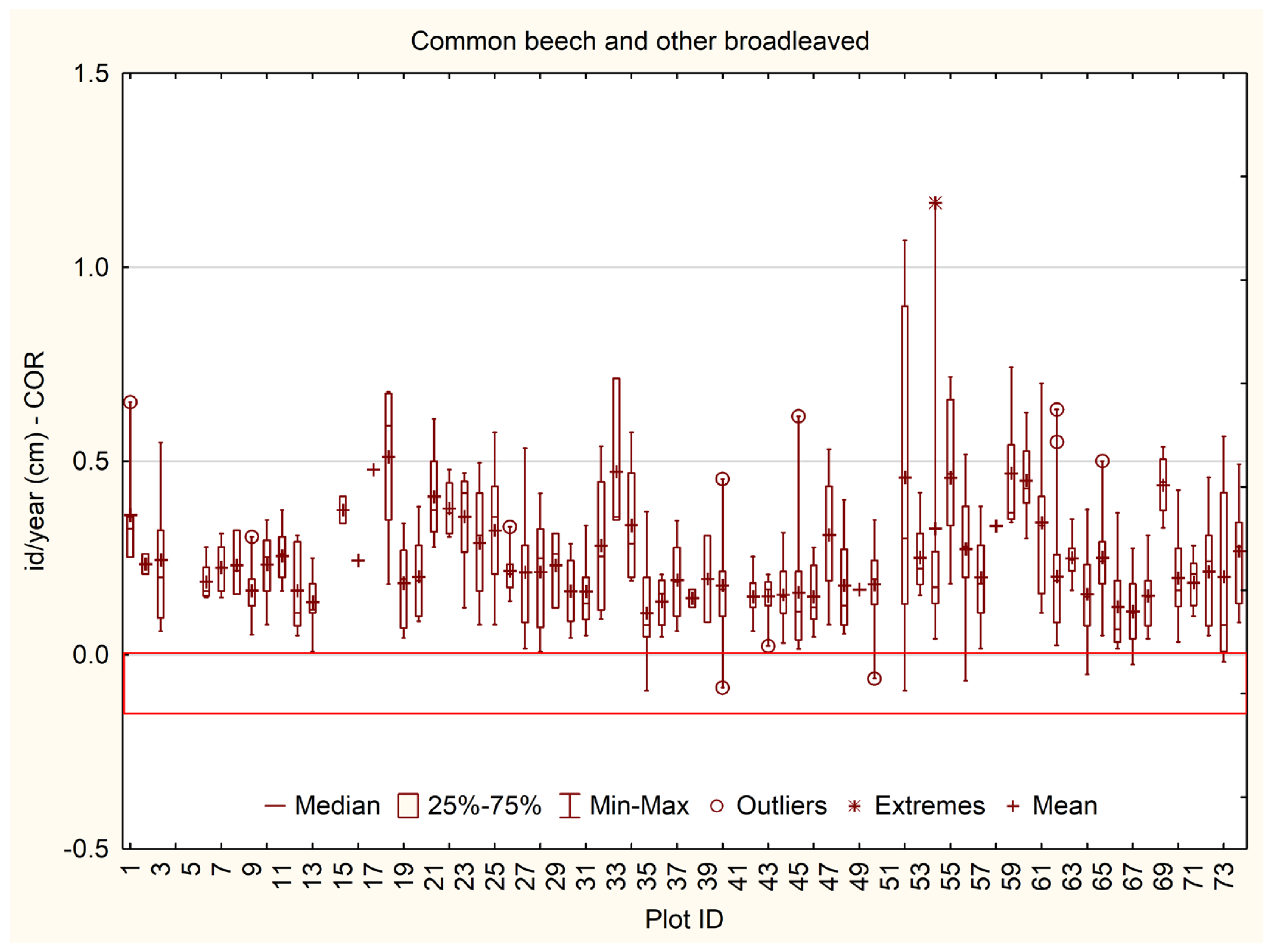 - High or low competition pressure on some plots, resulting in a below- or above-average increment of all trees on the plot, as presented in Figure 3. In these cases, data was considered as valid and retained without correction.