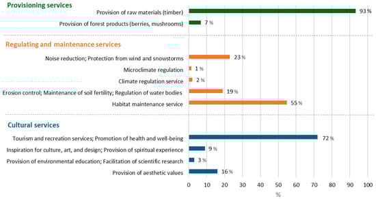 Within the category of cultural services, community members most frequently value tourism and recreation services, along with the promotion of health and well-being (72%) (Figure 2). The key themes relate to the preservation of recreational forests, health trails, and other leisure opportunities, which are regarded as integral to community well-being. The second most prominent aspect is aesthetic value (16%), where respondents emphasise the need to maintain the visual beauty of forest landscapes and the attractiveness of the area. Spiritual and cultural values (9%) encompass the role of forests in preserving local cultural heritage, historical sites, and spiritual connections. The least frequently mentioned aspect is the facilitation of environmental education and scientific research (3%), although respondents highlight the importance of these forests in supporting outdoor learning activities for local schools.