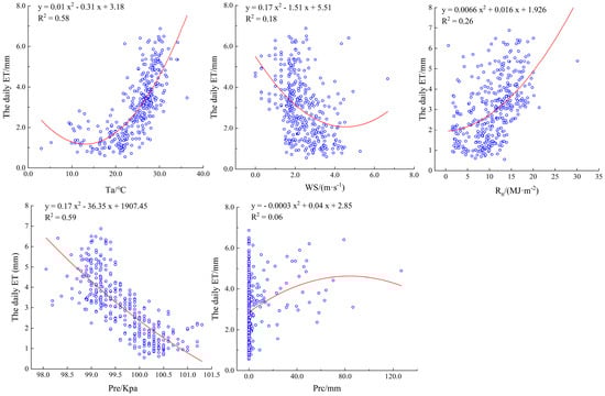As shown in Figure 5, the average daily ET of rubber plantations decreased and then increased with increasing Ta, with a coefficient of determination of 0.58. As WS increases, the average daily ET tends to decrease and then increase, and the correlation between the two is low, with a determination coefficient of 0.18. The correlation between the daily average ET and Rn is 0.26, and the daily average ET shows an upward trend. The daily average ET gradually decreases with the increase in Pre, and the determination coefficient R2 of the two reaches 0.59. The daily average ET shows an increasing and then decreasing trend with increasing Prc, and the correlation between the two was very low, with a coefficient of determination of 0.06.