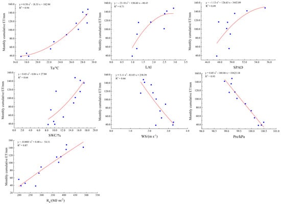 From Figure 6, the monthly cumulative ET of Ta, LAI, SPAD, SWC, and Rn are generally on the rise, with the highest determination coefficients of 0.94 and 0.87 for monthly cumulative ET and Ta and Rn, respectively. The determination coefficients of LAI, SPAD, SWC, and monthly cumulative ET are 0.71, 0.49, and 0.64, respectively. Monthly cumulative ET tended to decrease significantly with both Pre and WS, with a high correlation with Pre (R2 = 0.93), and with WS (R2 = 0.66).