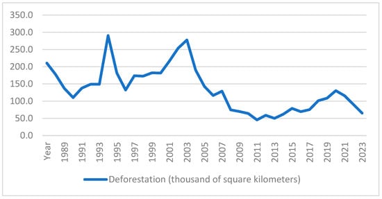 Deforestation in PRODES data (1988–2024) (km2 × 100). Source: data from the PRODES [36] website.