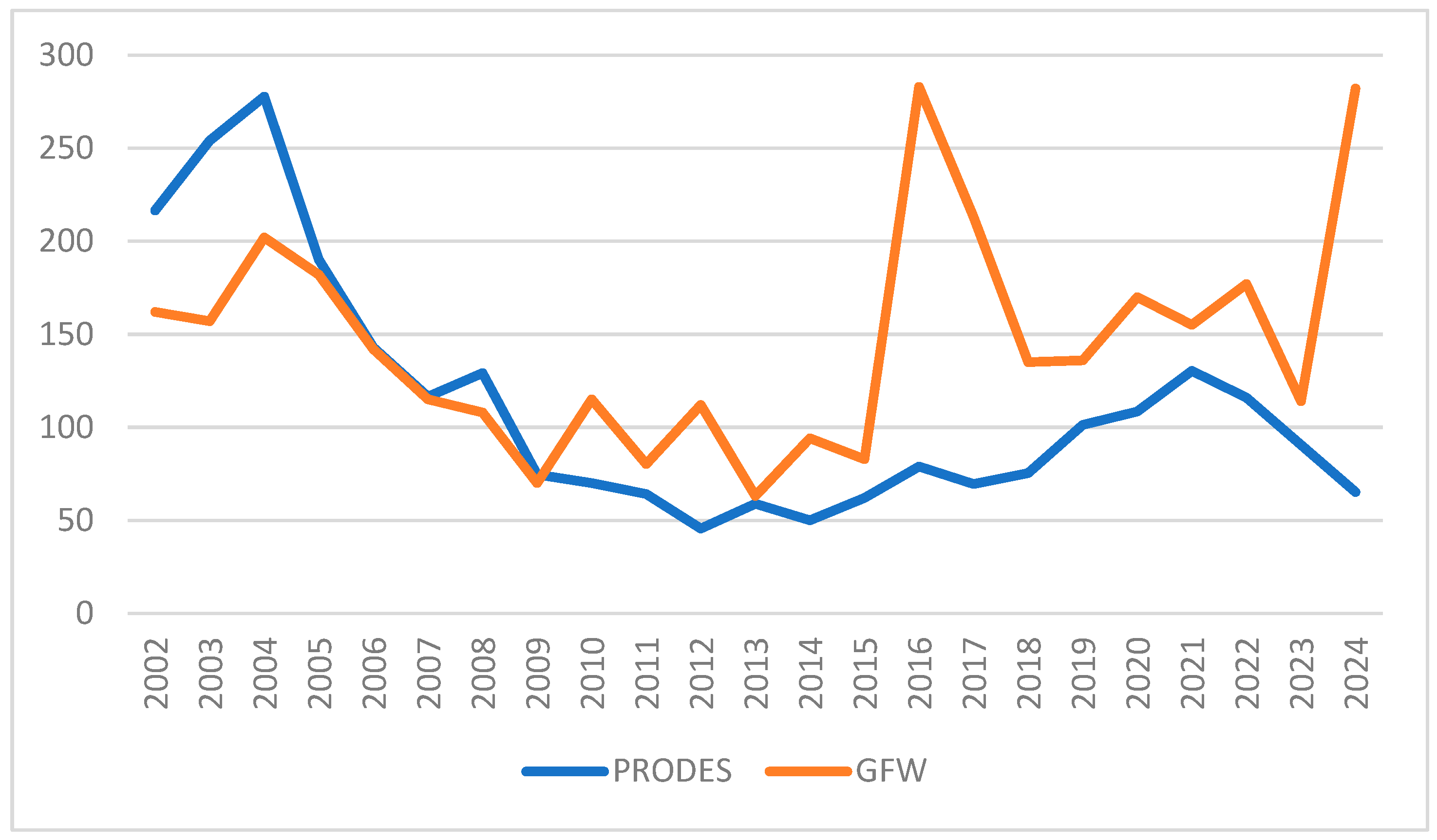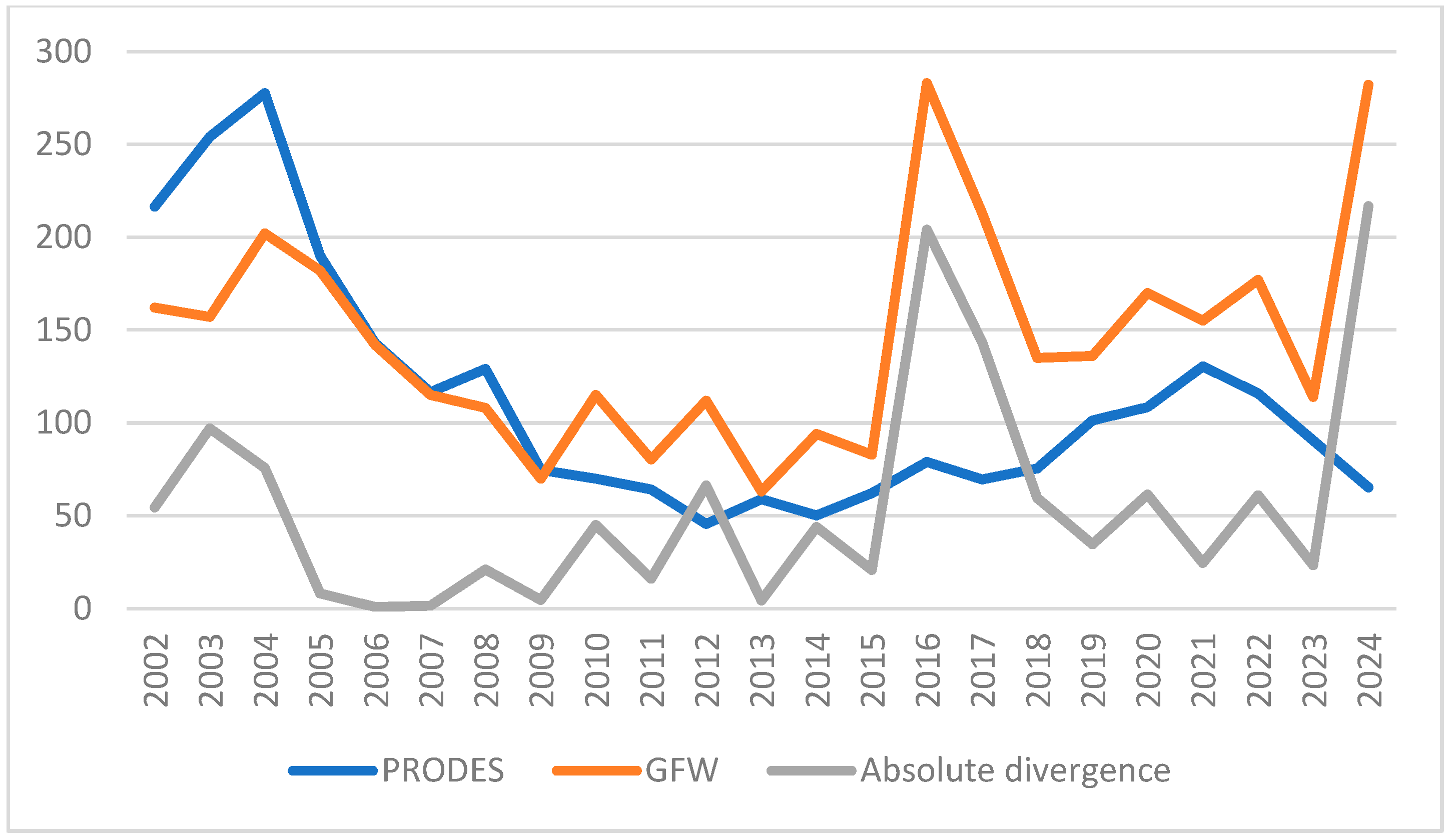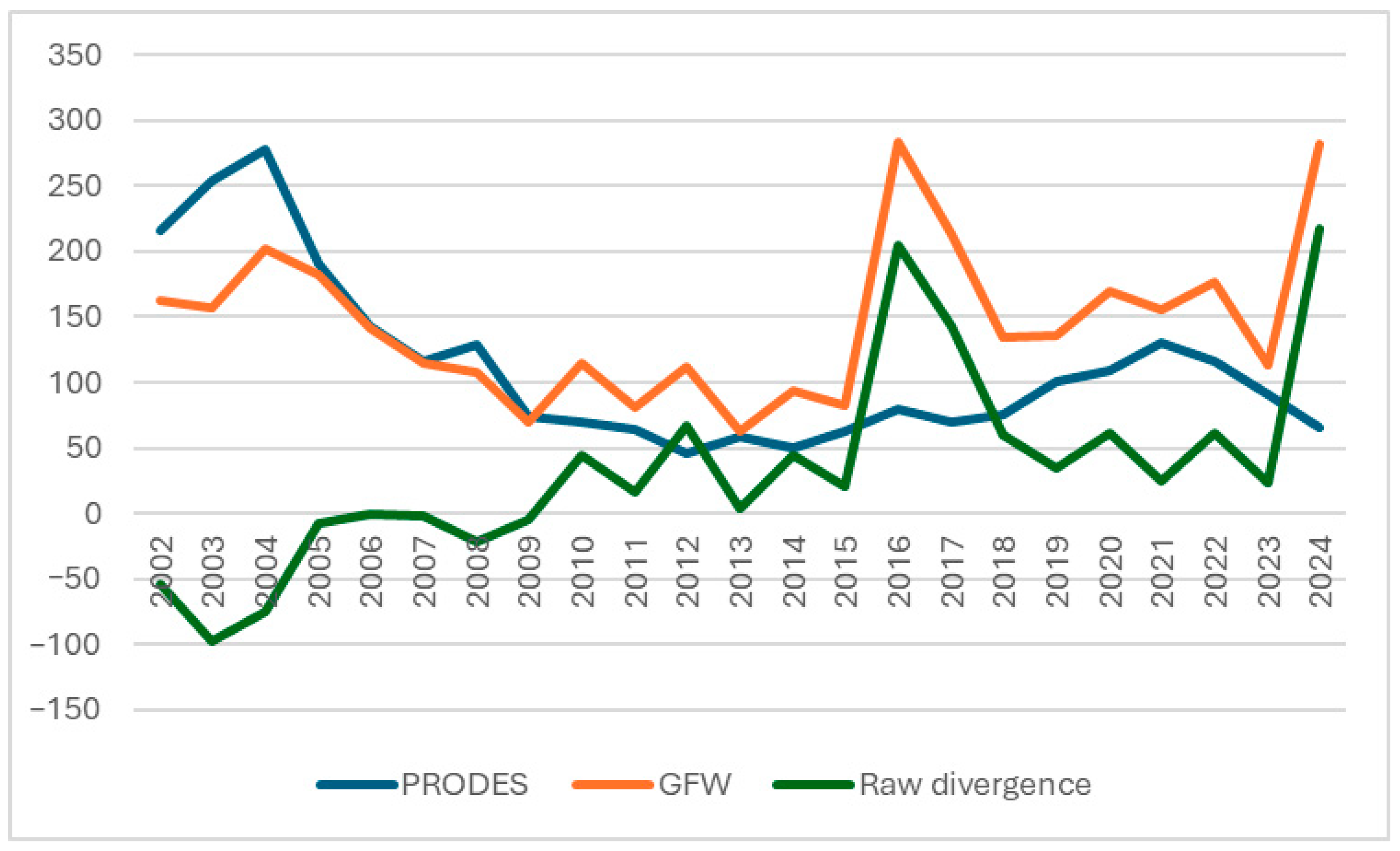 Table 8 indicate that while the period 2002–2014 indicated a moderate but stable increase in the divergence between PRODES and GFW, the 2015–2024 sub-period was characterized by a lack of trend and irregularity. This indicates that the GFW reacts to short-term changes in the second sub-period rather than to long-term increases in the differences with respect to the PRODES.