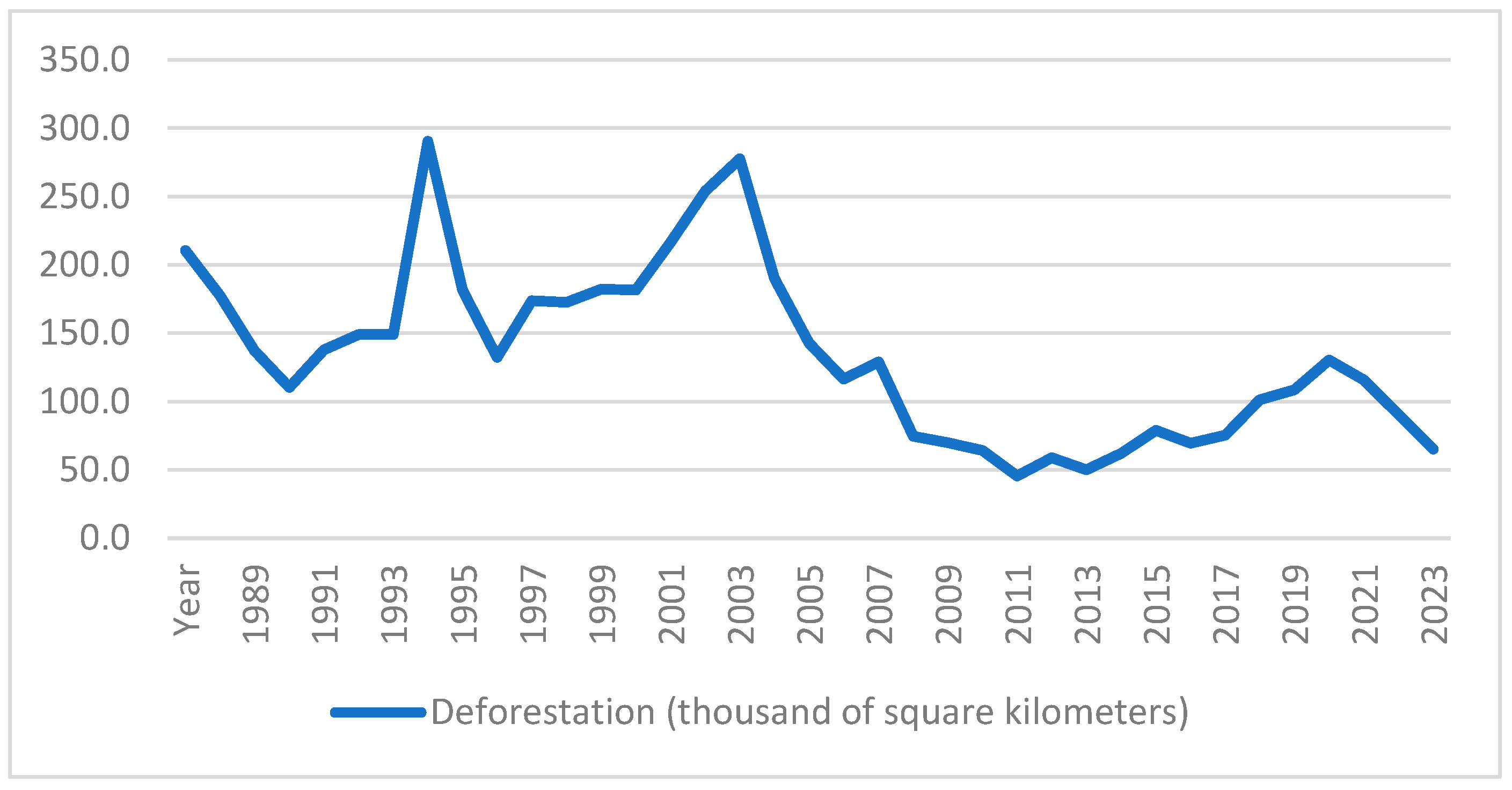37], records much smaller areas (as much as 0.09 ha) in which even natural tree stand die-offs are recorded, which are not significant from the perspective of industrial logging. Importantly, PRODES analyses are validated by analysts to interpret the origins of deforestation (anthropogenic or non-anthropogenic) and also focus on primary forests such as the Amazon. Thus, it is a more appropriate indicator to determine the impact of product exports on deforestation. However, to consistently examine the measurement methods and to deepen the conclusions as much as possible, the relationships between these indicators were analyzed. First, the data were normalized to hectares and presented in the graphic below (PRODES presents data in km