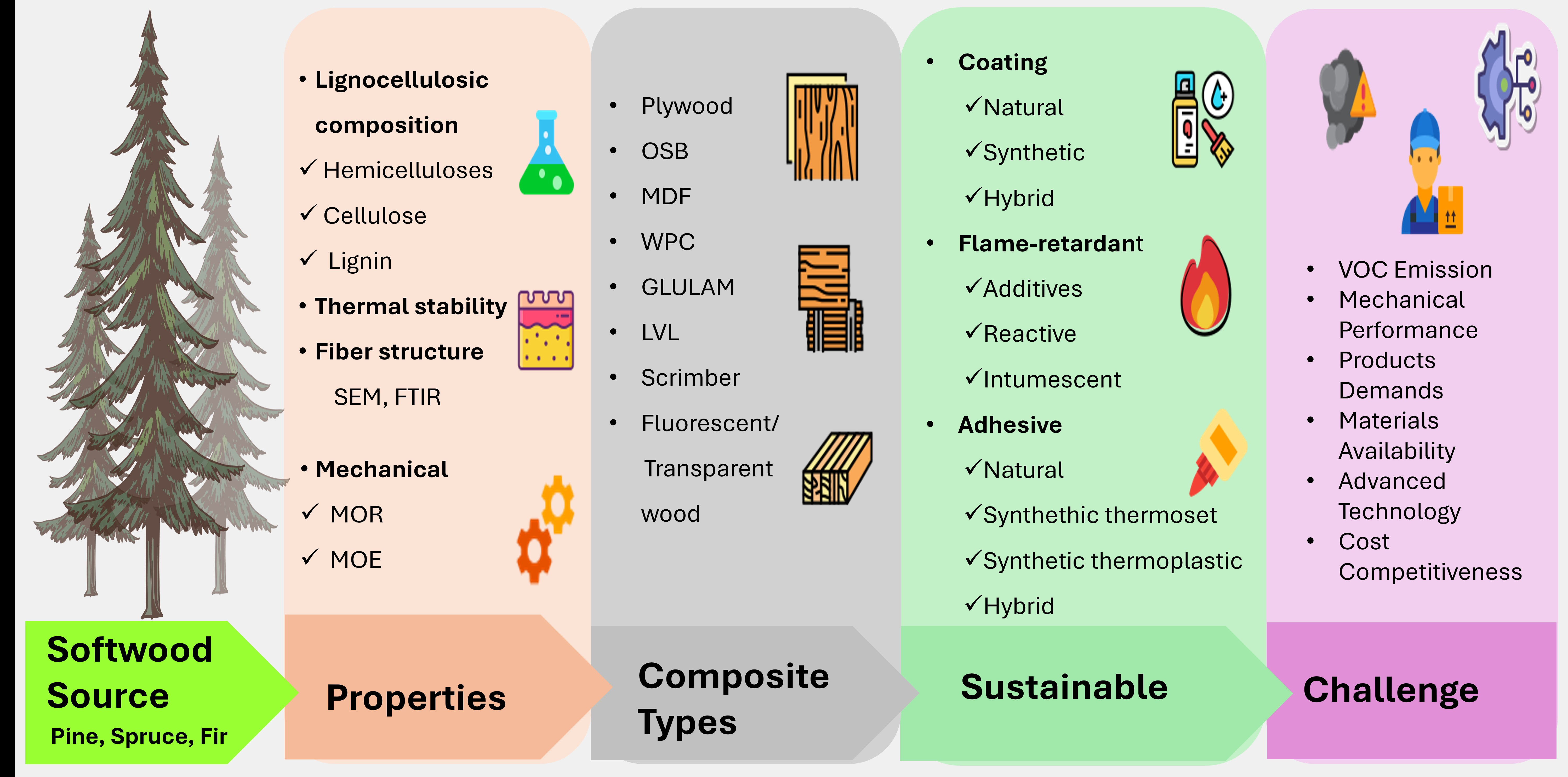 | Market and cost competitiveness | Use of low-cost softwood species, efficient production | Hybrid composites, cost-effective nanomaterials, and scalable manufacturing technologies |
