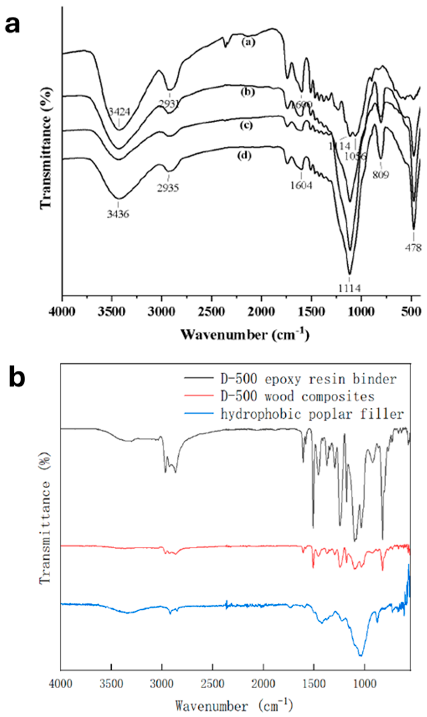 - Rasmussen, J.S.; Barsberg, S.; Venås, T.M.; Felby, C. Assessment of covalent bond formation between coupling agents and wood by FTIR spectroscopy and pull strength tests. Holzforschung 2014, 68, 799–805. [Google Scholar] [CrossRef][Green Version]