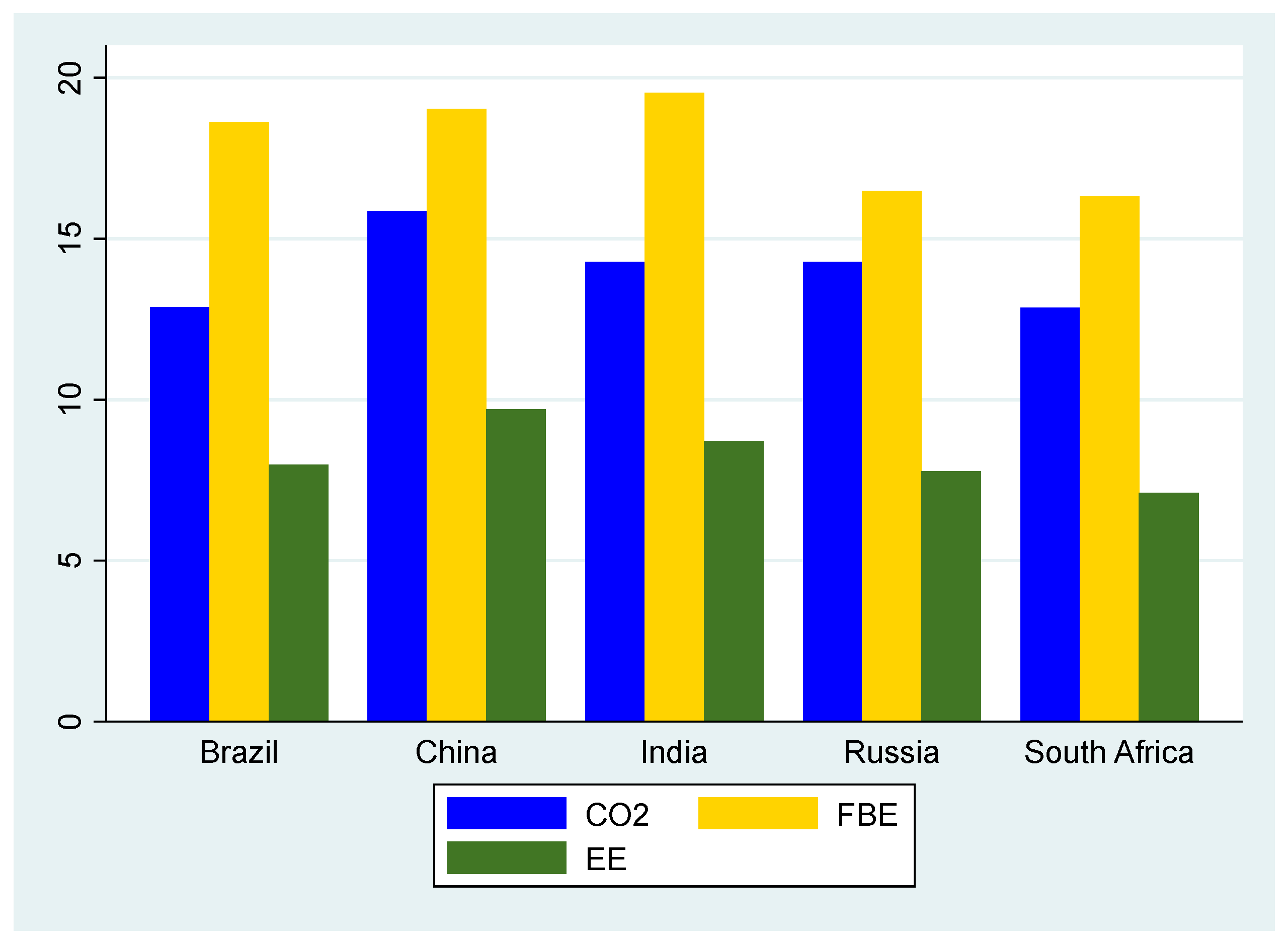 2 emissions is found to be insignificant in Russia, while EE (−0.264 **) significantly reduces emissions. Finally, FBE and EE exhibit an insignificant effect on CO