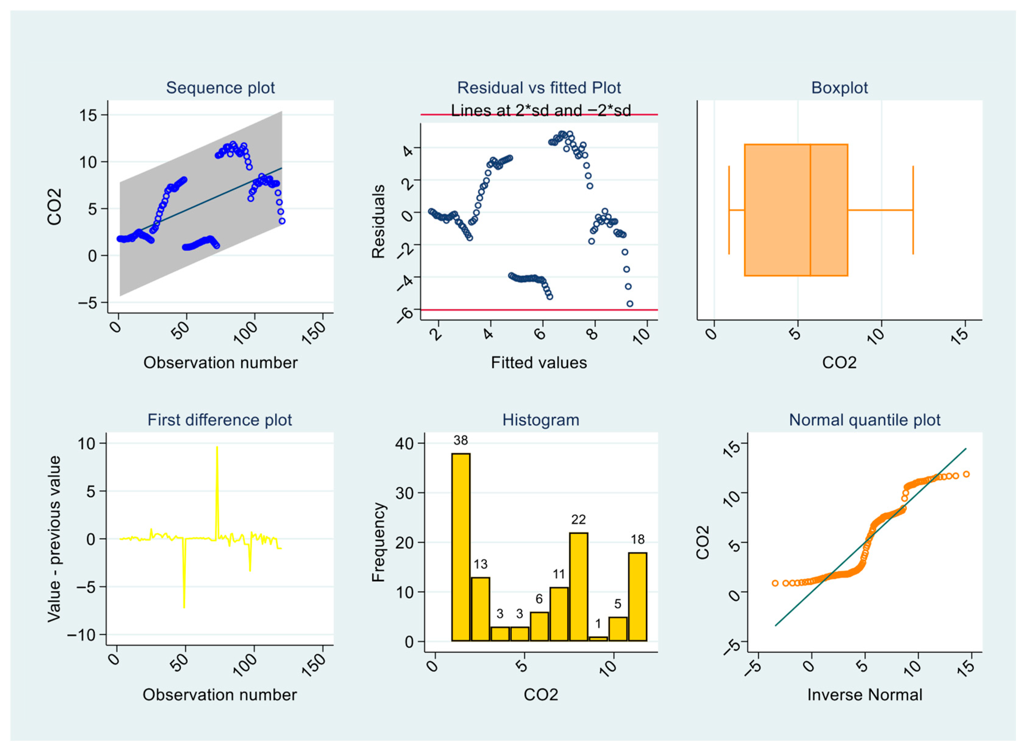 2 exhibits a clear upward trend, indicating non-stationary behavior. The residual-versus-fitted plot reveals a non-linearity and heteroscedasticity. The boxplot highlights the presence of outliers. The first-difference plot reveals that differencing stabilizes the series. The histogram and normal quantile plot show that CO