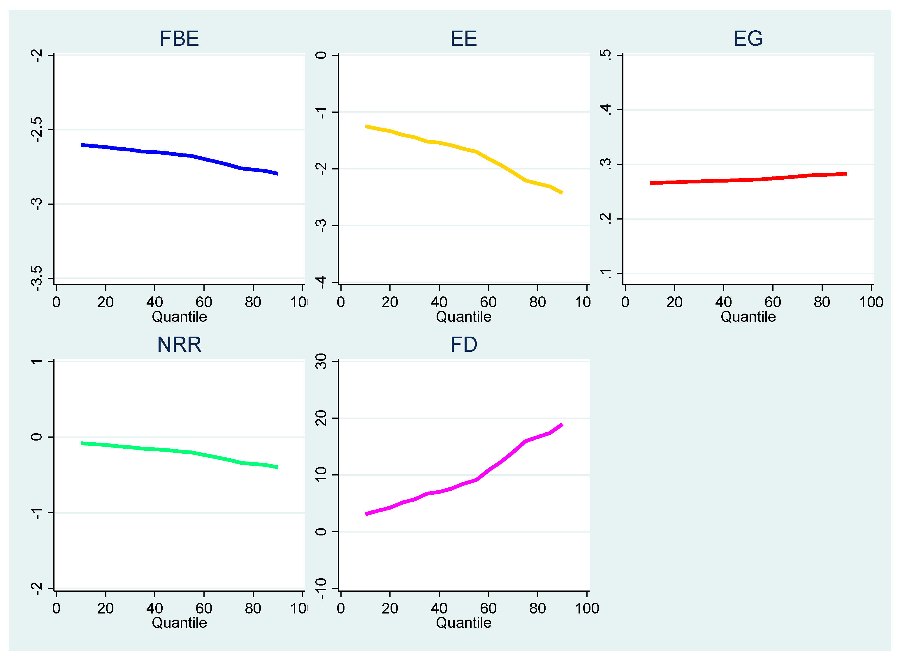 2 across 0.10 to 0.90 quantiles. The findings reveal that the coefficient of FBE is negative and highly significant at all quantiles, indicating that an increase in forest bioenergy is associated with a reduction in the dependent variable across the entire distribution. However, the magnitude of the negative effect becomes slightly stronger at higher quantiles. This pattern implies that the mitigating role of forest bioenergy intensifies as the level of the dependent variable increases, highlighting its stable contribution to emission reduction outcomes. Similarly, EE exhibits a strong and statistically significant negative effect on CO