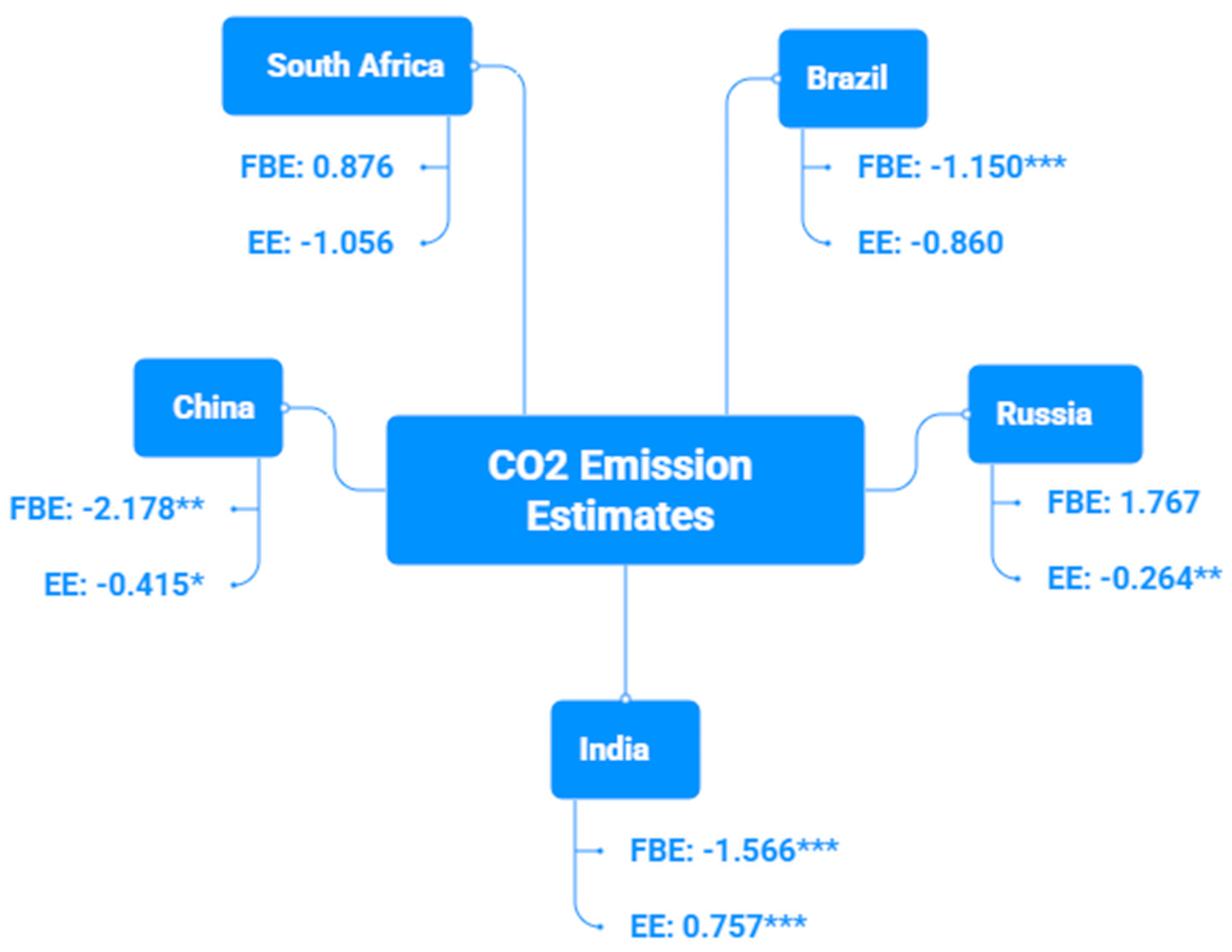 2 emissions. In Brazil, the FBE coefficient is −1.150, which confirms a significant emission-reducing role; although the EE coefficient is −0.860, the effect is statistically insignificant. Conversely, the FBE effect on CO