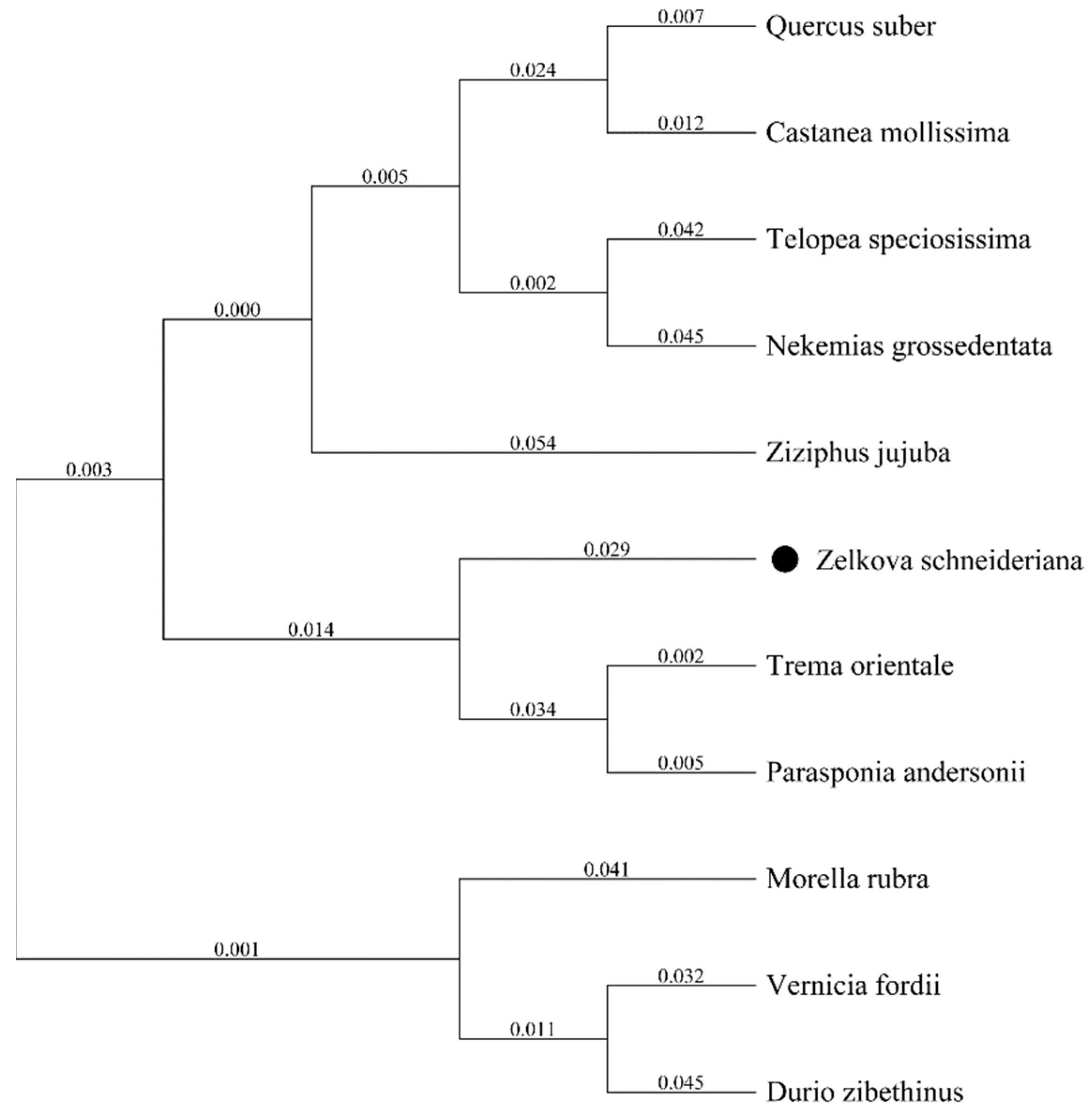 - Sun, Y.; Gong, L.; Liu, X.; Su, J.; Lu, X.; Xu, J. Genome-wide profiling of the genes related to leaf discoloration in Zelkova schneideriana. Forests 2024, 15, 1146. [Google Scholar] [CrossRef]