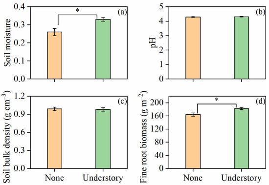 Soil moisture (a), soil pH (b), soil bulk density (c), and fine root biomass (d) under different understory vegetation treatments. Values represent means ± standard error (n = 8). Asterisks (*) denote significant differences at the p < 0.05 level.