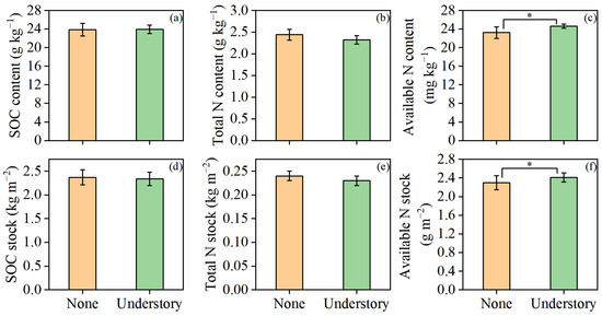 Contents and stocks of soil organic carbon (SOC) (a,d), total nitrogen (N) (b,e), and available N (c,f) under different understory vegetation treatments. Values are presented as means ± standard error (n = 8). Asterisks (*) indicate significant differences at p < 0.05.