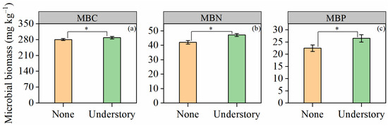 Soil microbial biomass C (MBC), N (MBN), and P (MBP) exhibited consistent responses to understory vegetation management. Compared with the none treatment, the understory treatment significantly increased the contents of MBC, MBN, and MBP by 2.9%, 12.1%, and 18.1%, respectively (p < 0.05; Figure 3).