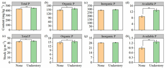 Contents and stocks of soil total (a,e), organic (b,f), inorganic (c,g), and available phosphorus (P) (d,h) under different understory vegetation treatments. Values are expressed as means ± standard error (n = 8). Asterisks (*) denote significant differences (* p < 0.05, ** p < 0.01).