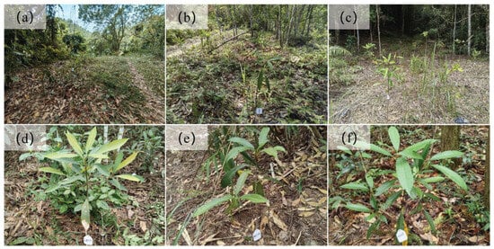 Field restoration and growth conditions of Madhuca hainanensis saplings. (a–c): Field restoration sites at different elevations (low, medium, and high); (d–f): Growth performance of M. hainanensis saplings at different elevations in June 2025.